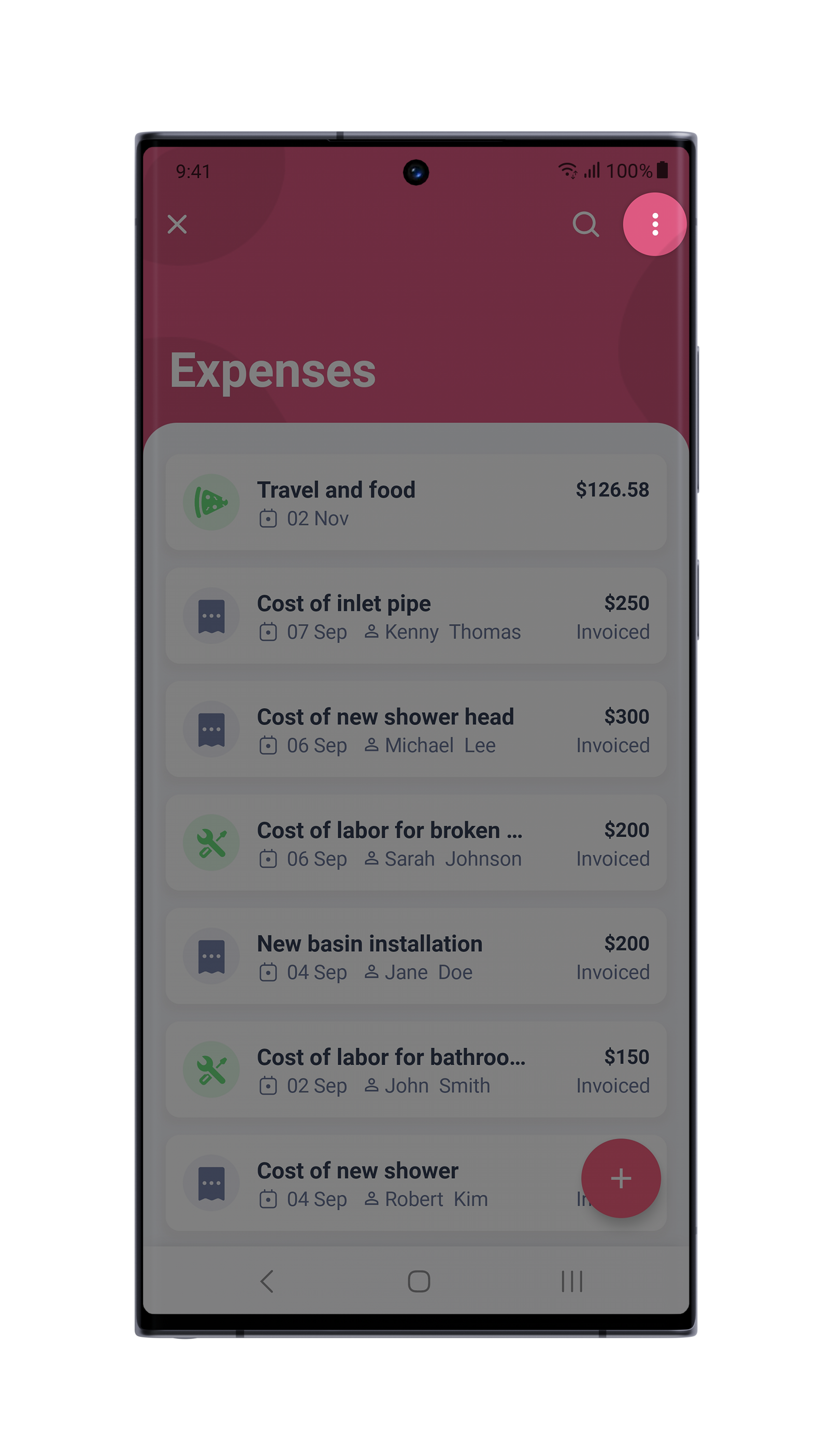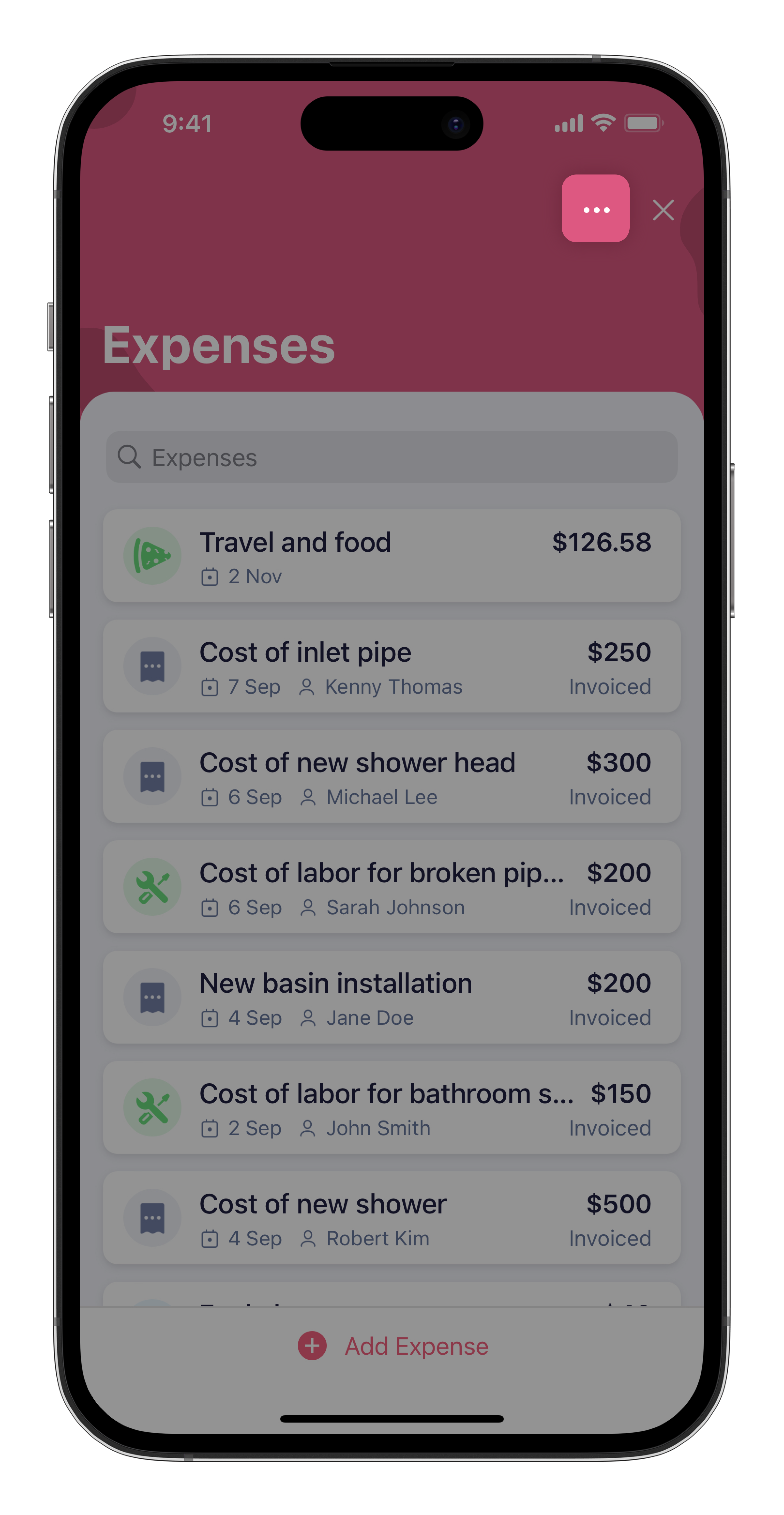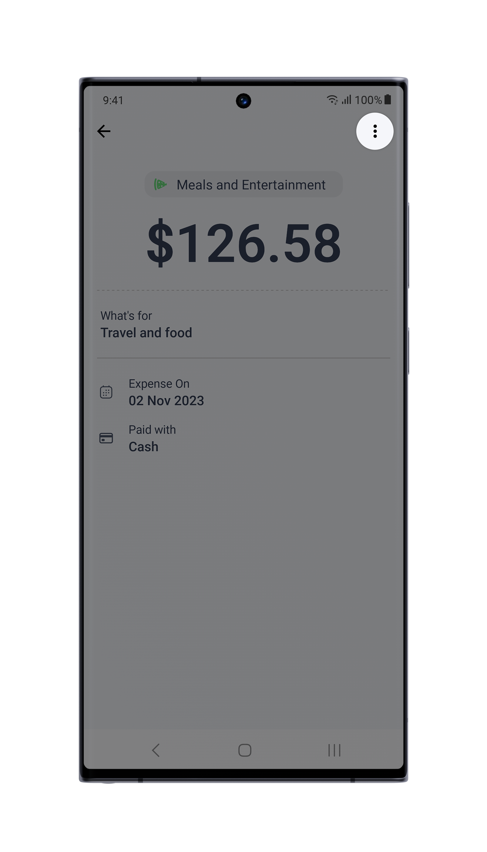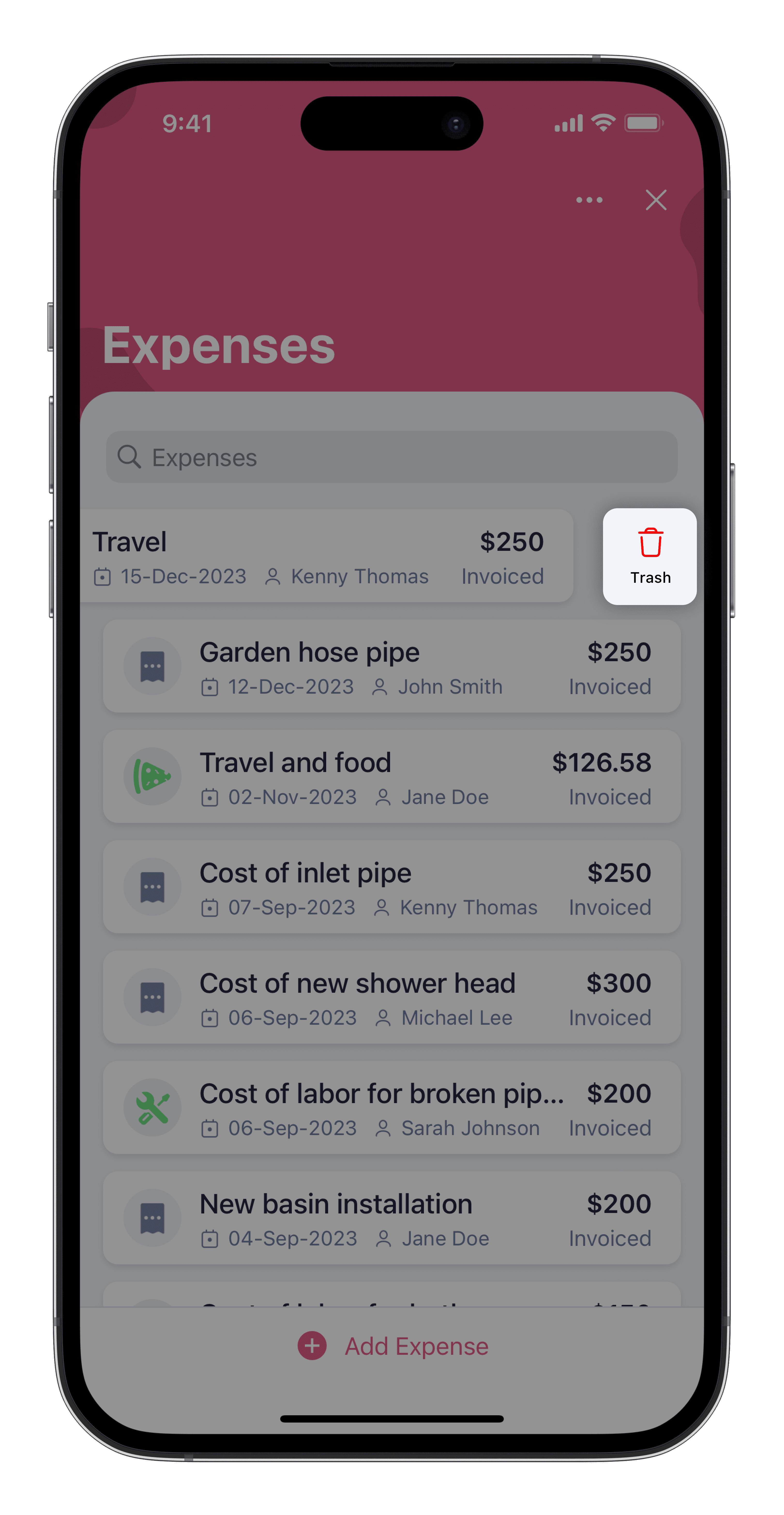 Open an expense, click the three dots at the top-right corner of the page, and click Trash.