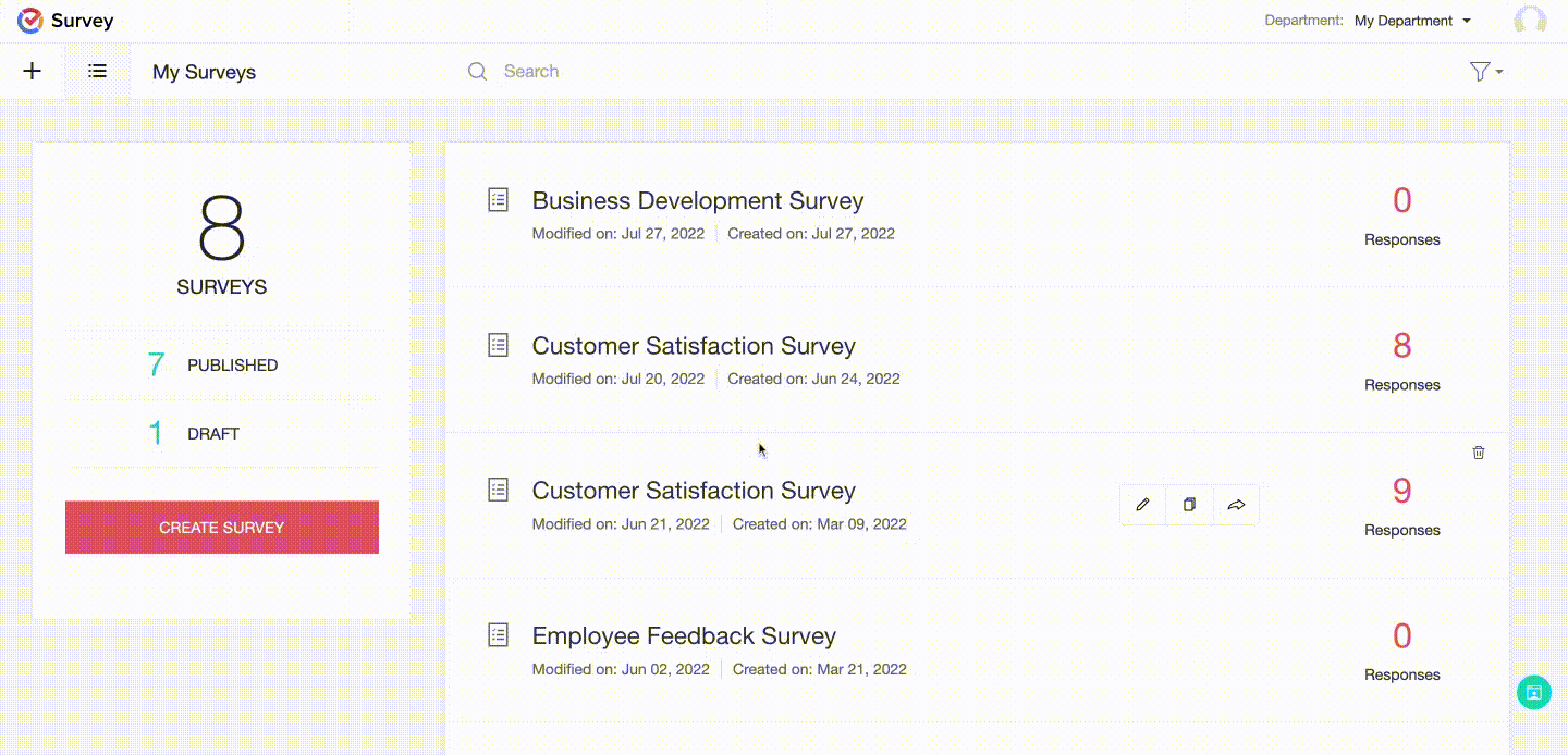 Zoho Survey provides a user-friendly interface for creating customized surveys to help you start gathering customer feedback right away. There are four ways to create surveys: Create survey from scratch Using templates Copy from existing survey ...