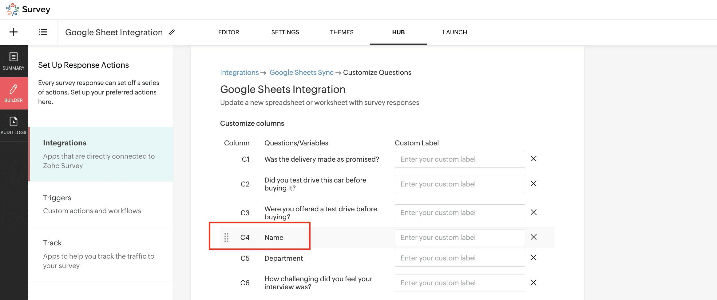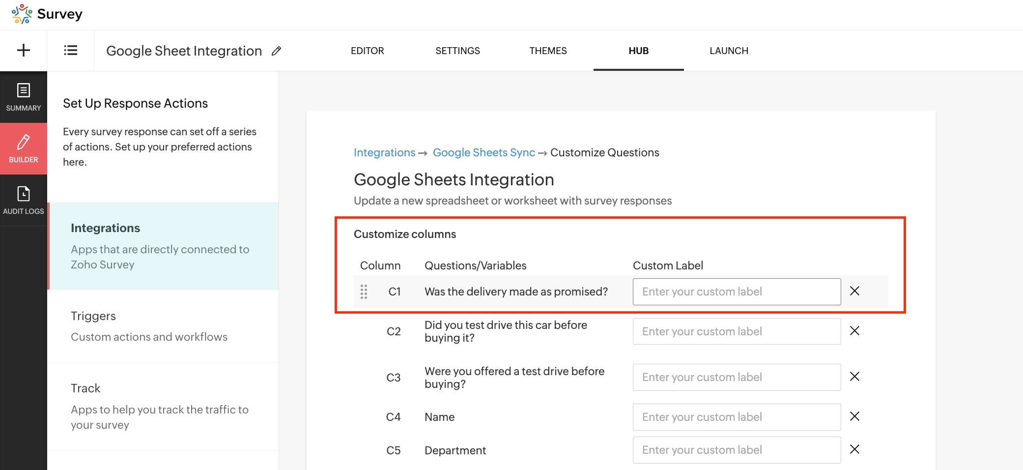 Add Custom labels for each questions type, if required: You can provide custom labels as column headers. For example, if the question in the survey is Gender, but you want it to be renamed as Sex in the sheet, just type it as the custom label.