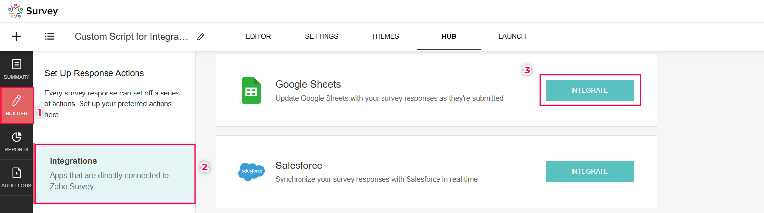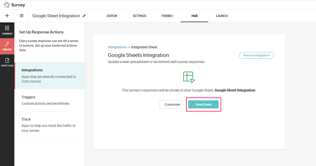 Navigate to Builder >Hub >Integrations, then click Integrate for Google Sheet.