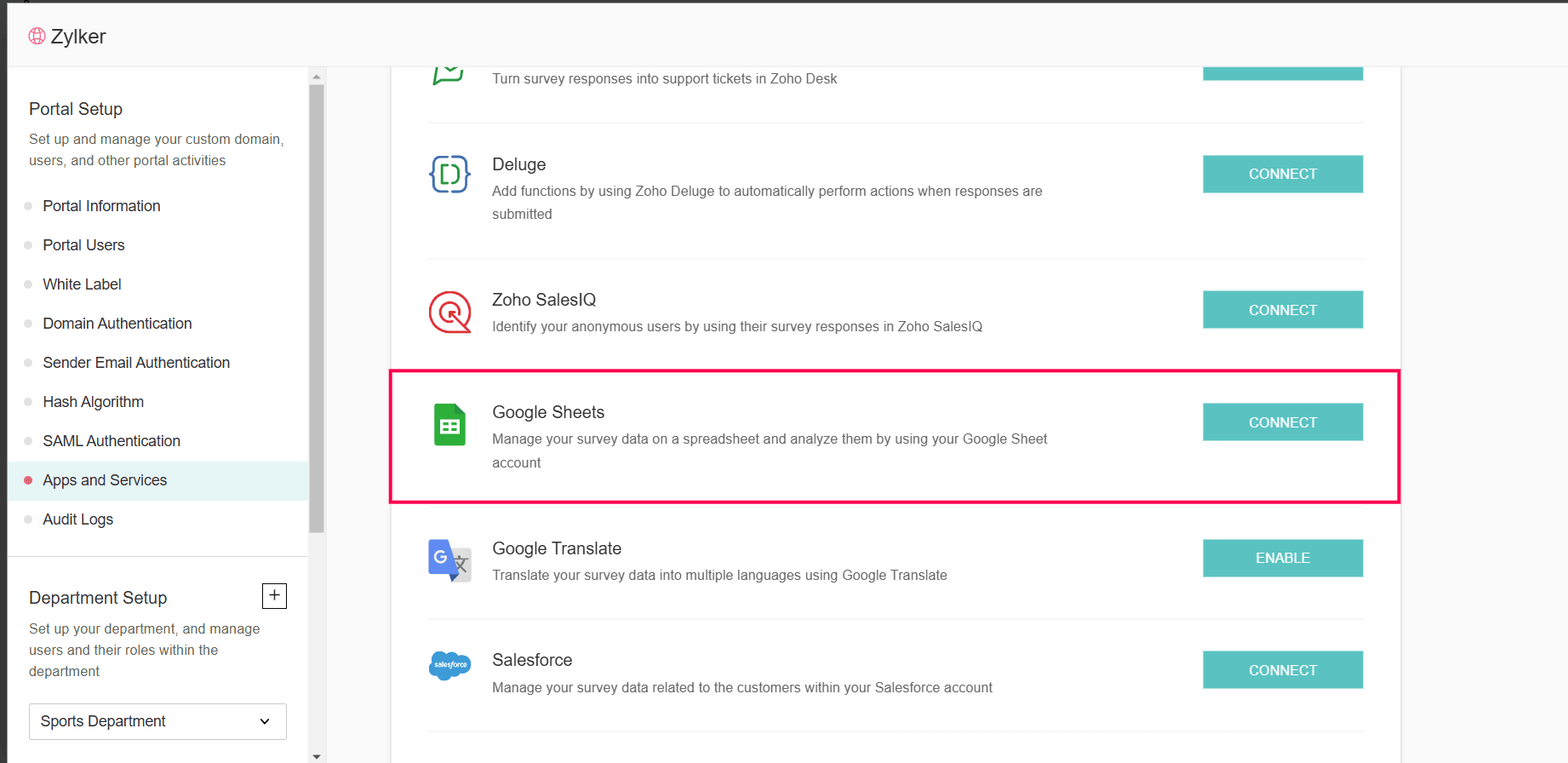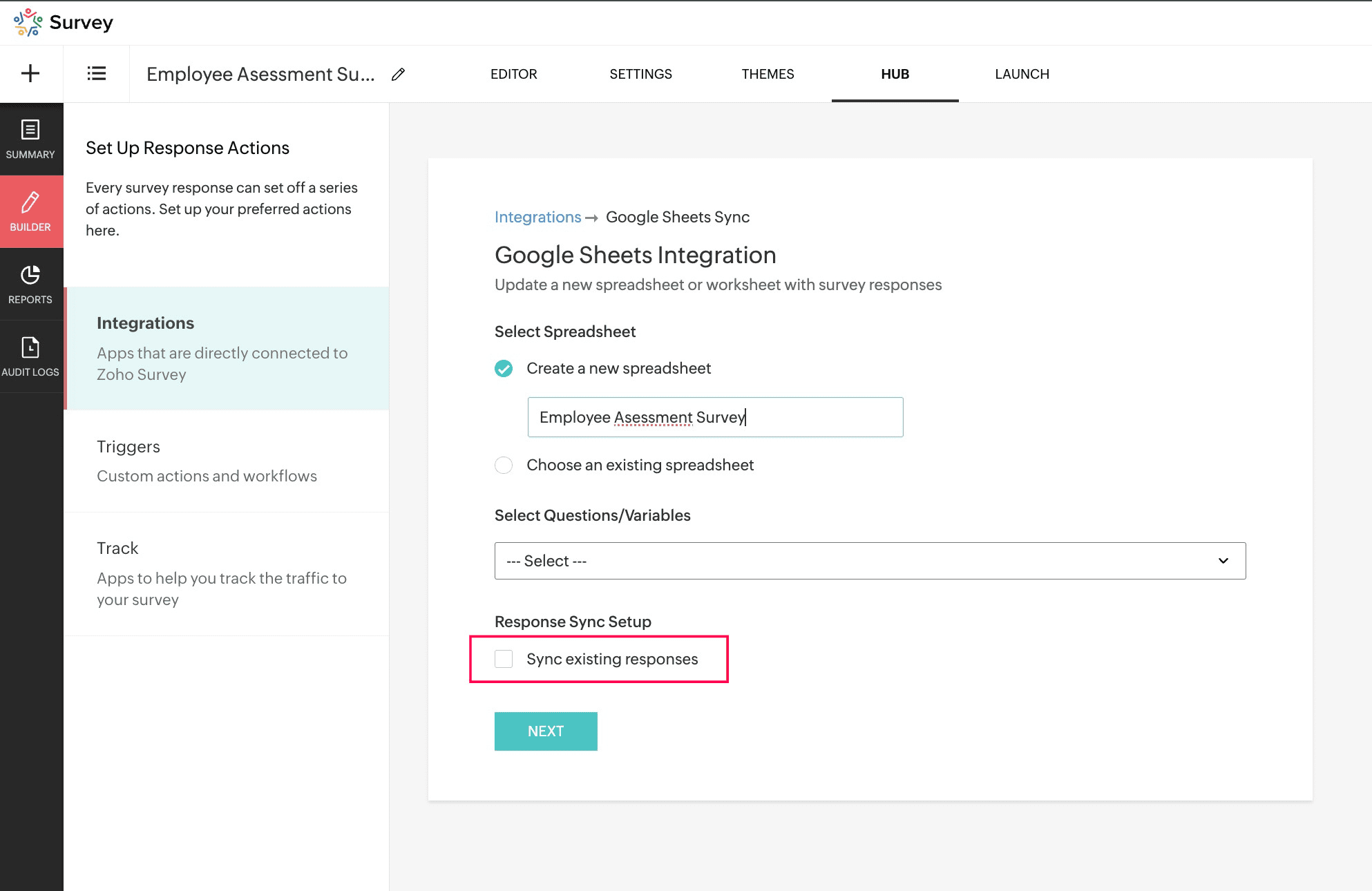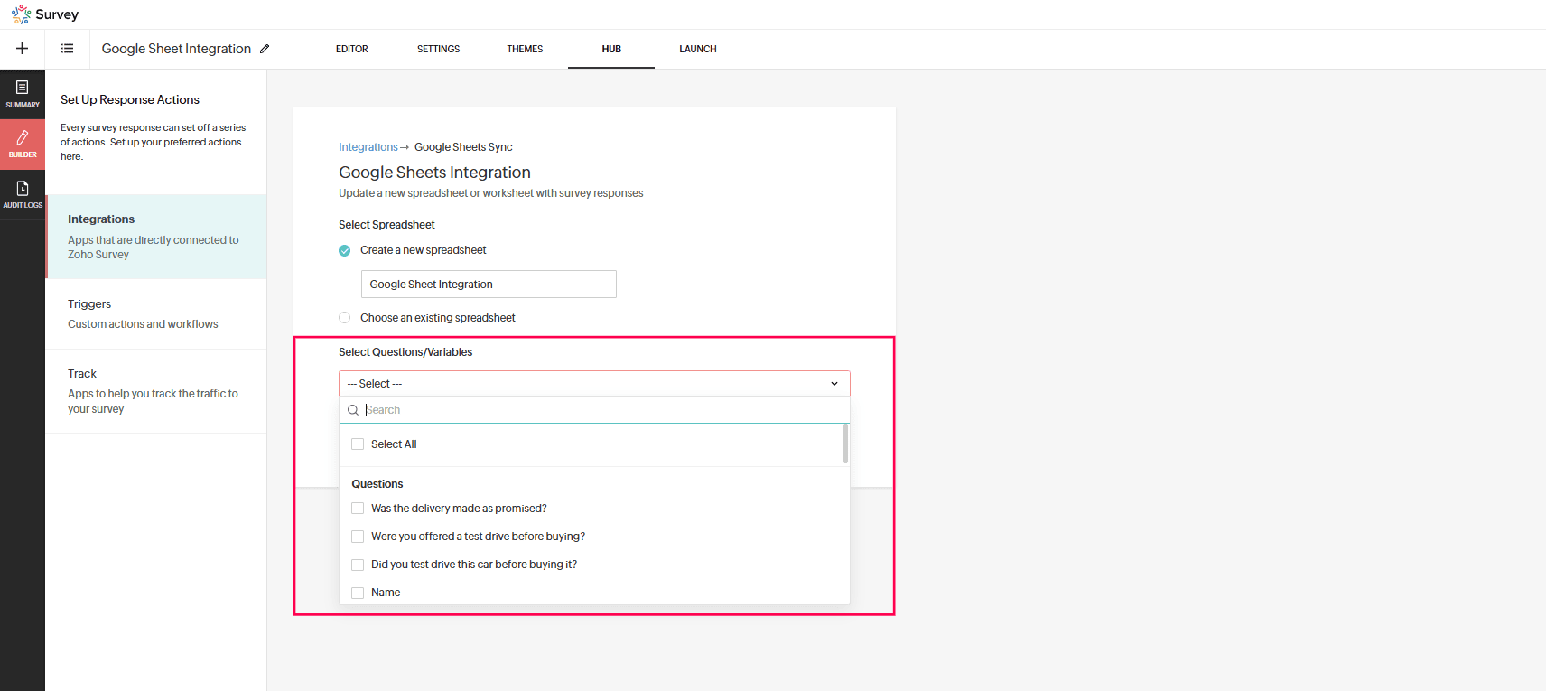 Google sheet integration can be enabled in your Zoho Survey account with the Pro and Enterprise plans.