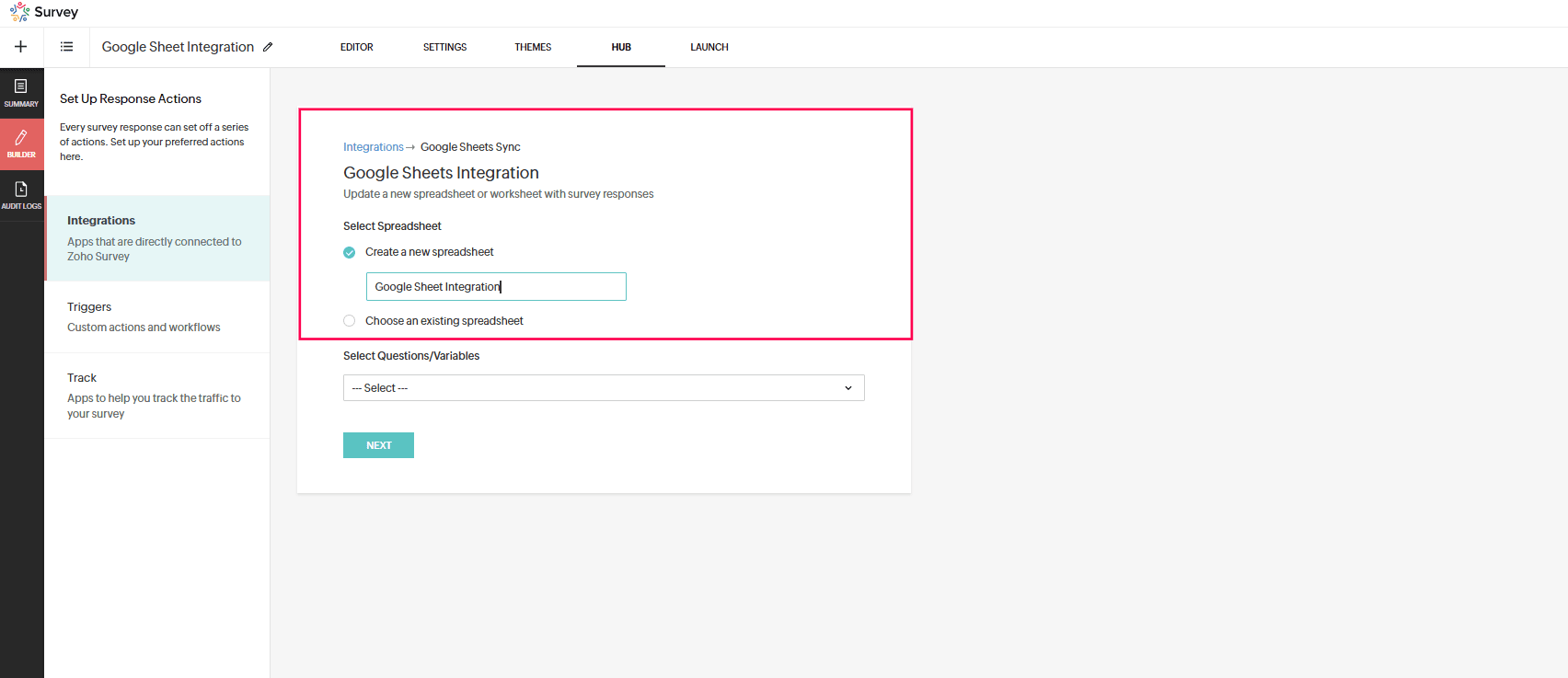 In the same page, select the questions and variables that should be pushed to Google Sheet, then click Next.