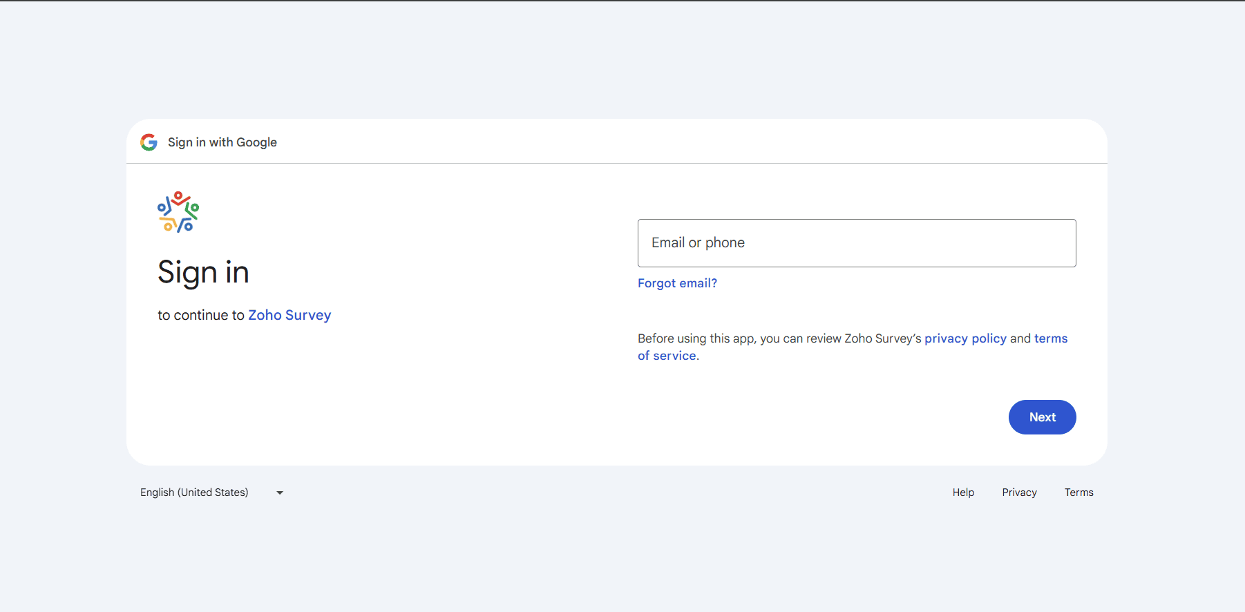 Sign in and authenticate the Google account where you wish to host Google Sheets and link it to your Zoho Survey account.