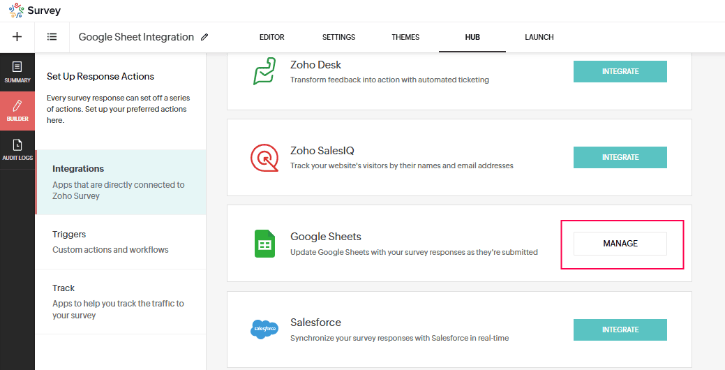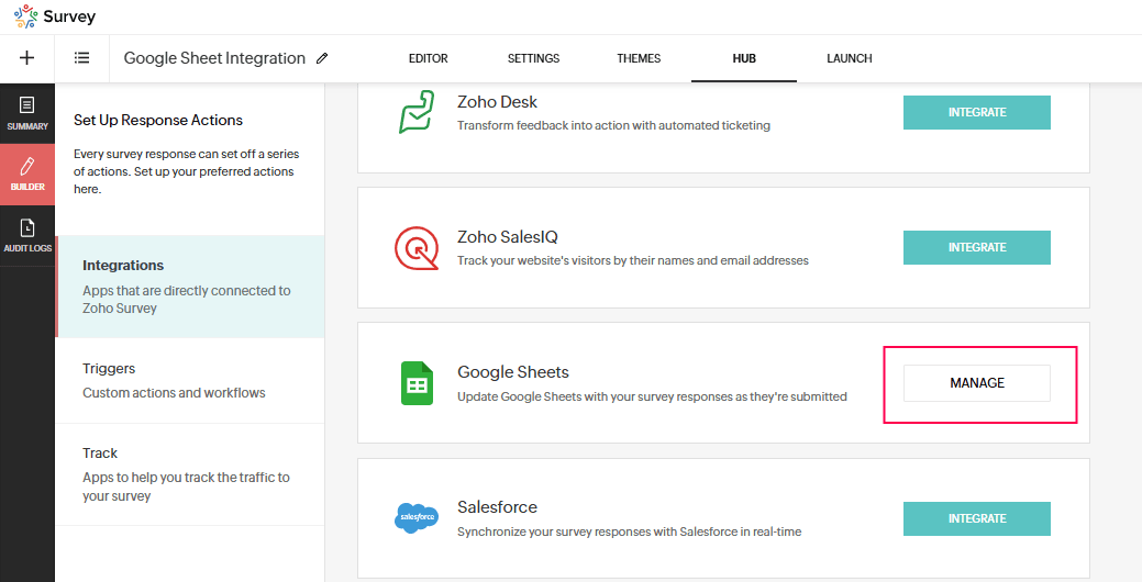 Navigate to Builder >Hub >Integrations, then click Manage for Google Sheet