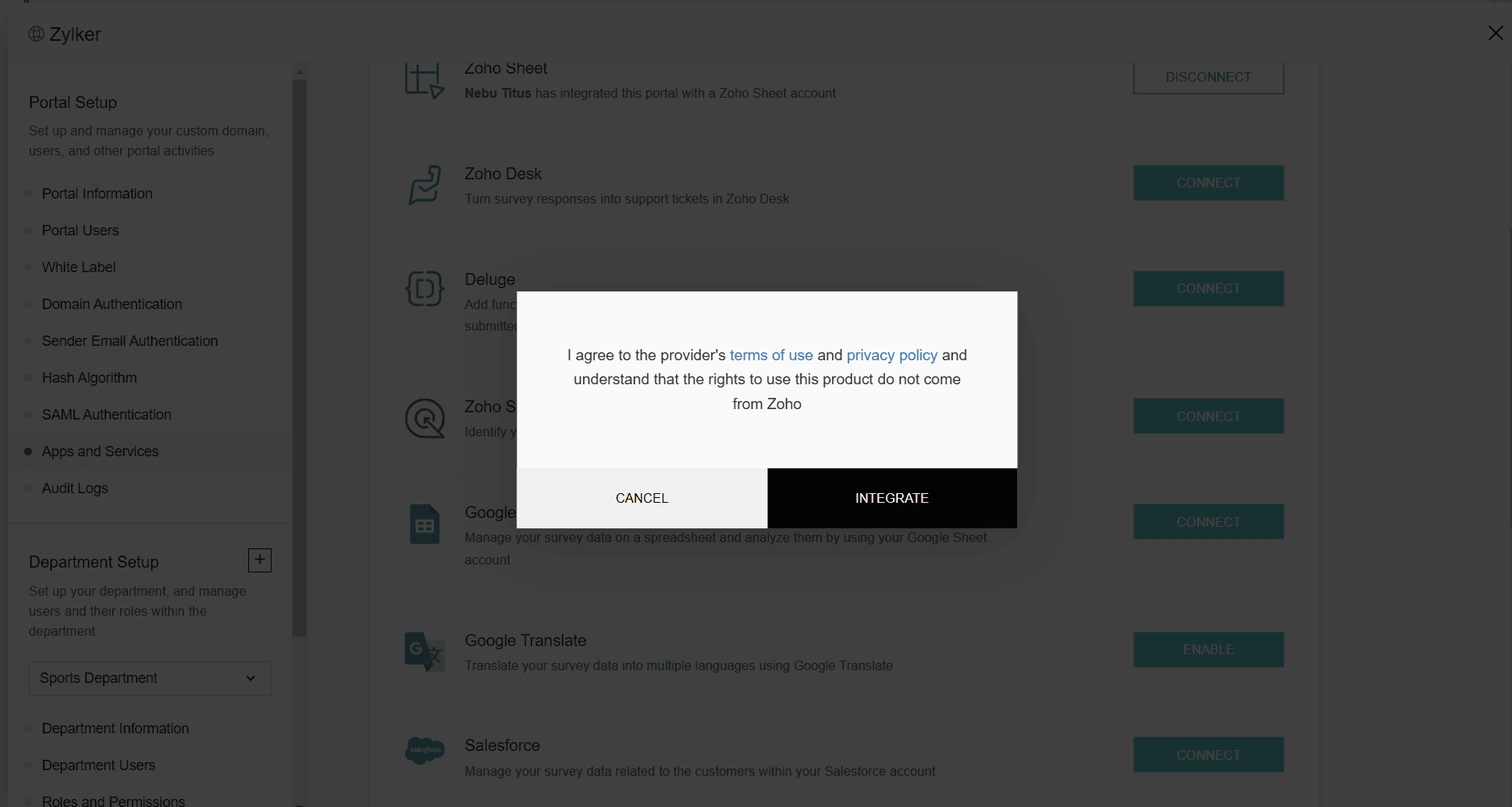 Accept Zoho's Terms & Conditions by clicking Integrate.