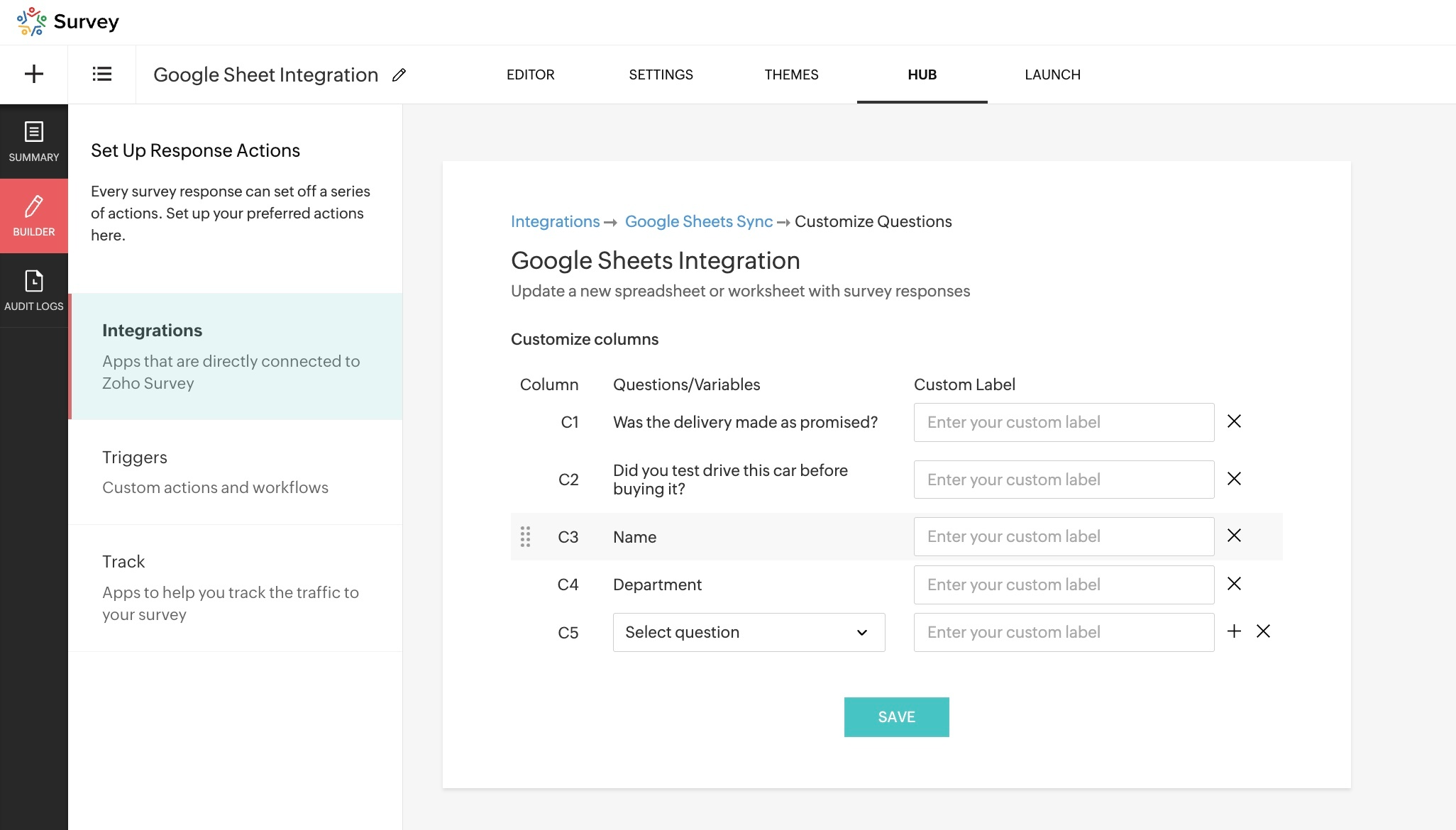 This integration automatically pushes your responses from your survey into a Google spreadsheet when your respondents submit their responses.