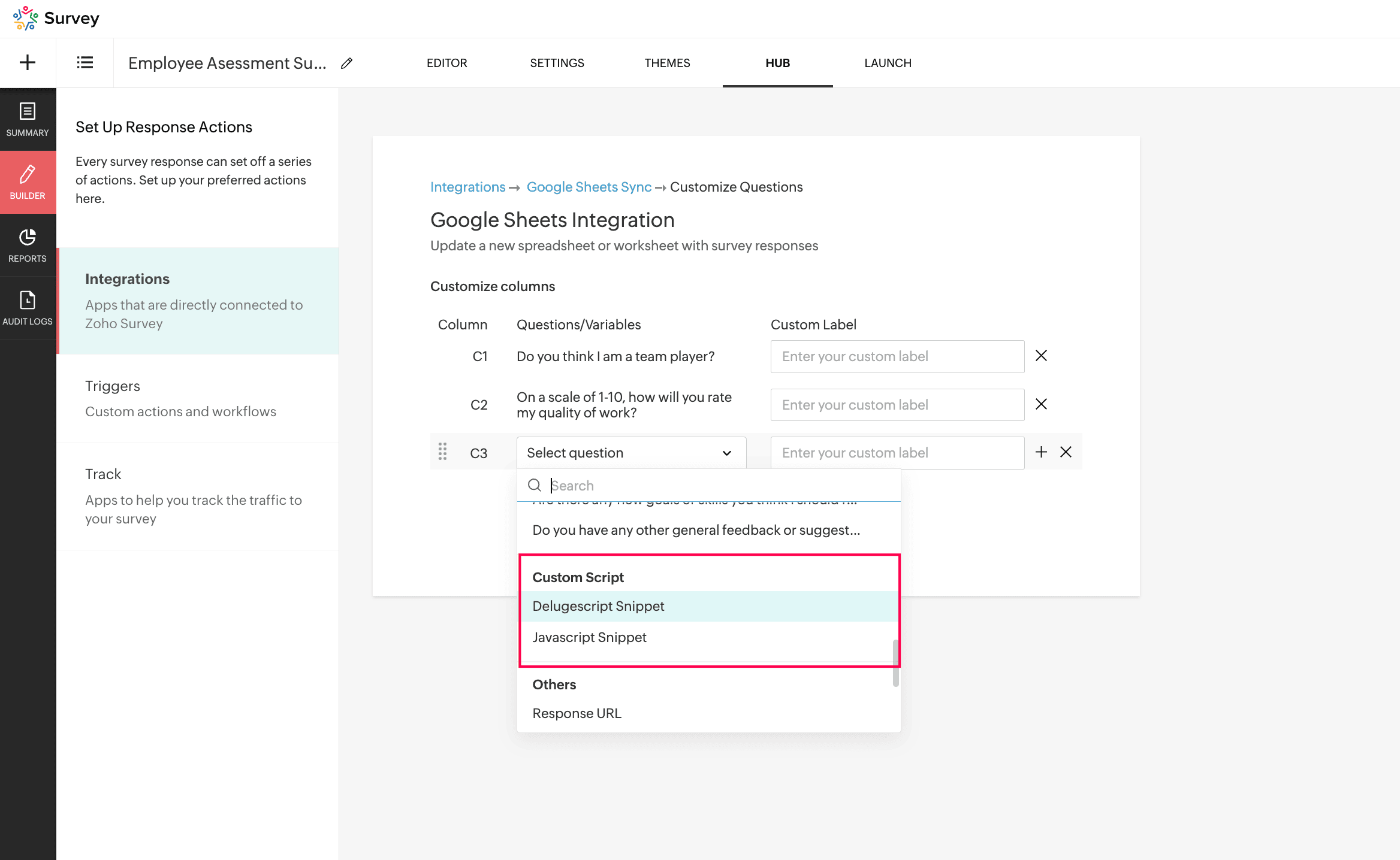 Custom scripts are short snippets of code that can be used to run a complex logic in your survey. It can be used in the integration of Zoho Survey and Google Sheet to design outputs that will enhance your response analysis and reports