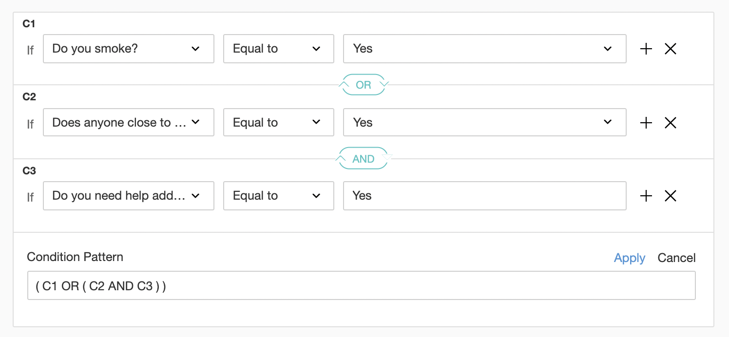 Note: Multiple conditions work in a pattern similar to this: (((((C1 and/or C2) and/or C3) and/or C4) and/or C5) and/or ...) where C1, C2, C3, ... are conditions. |