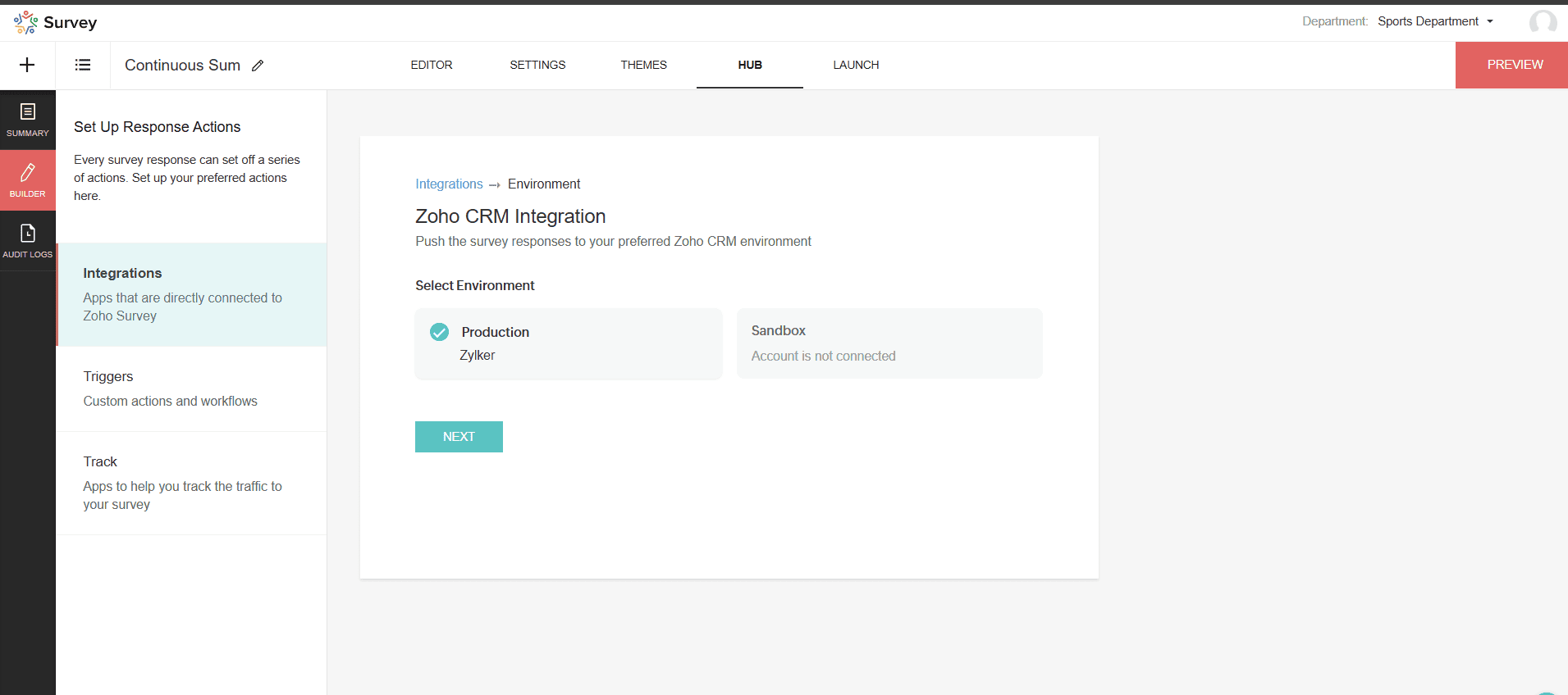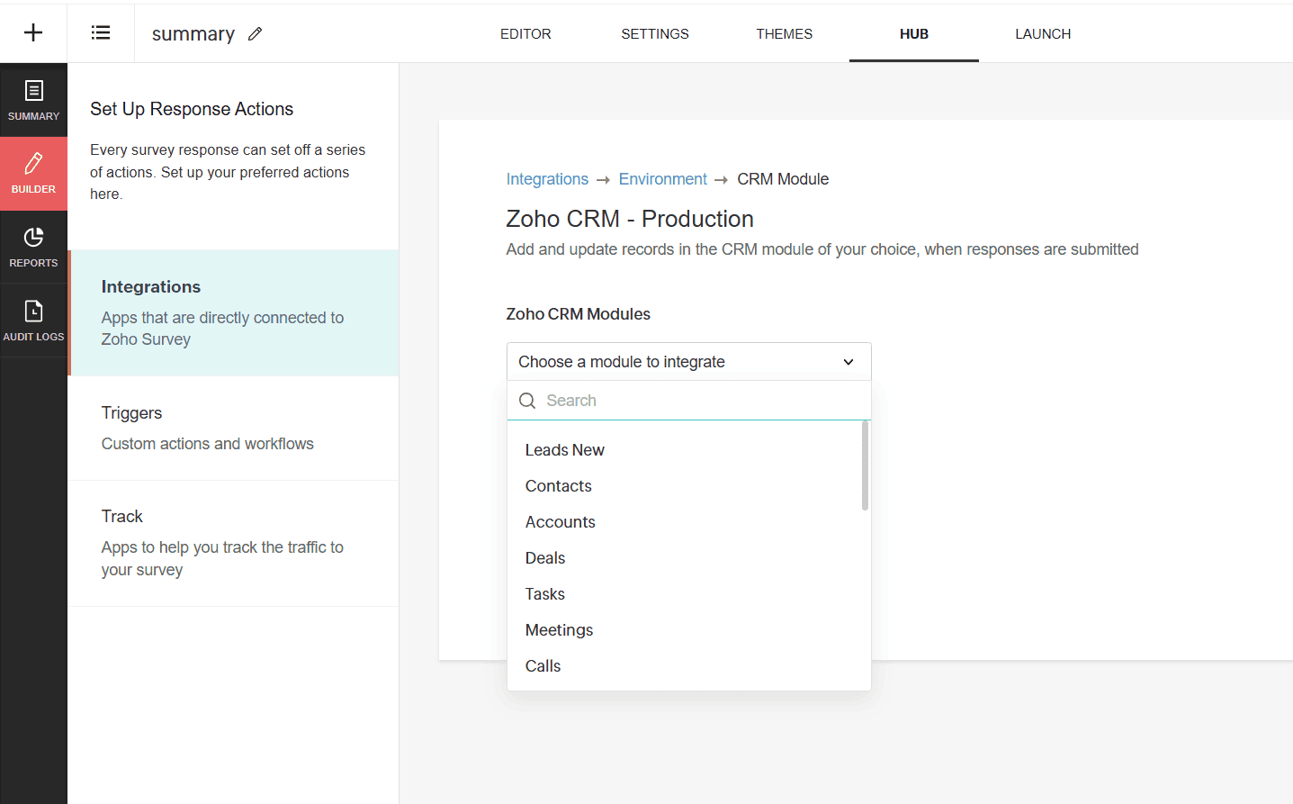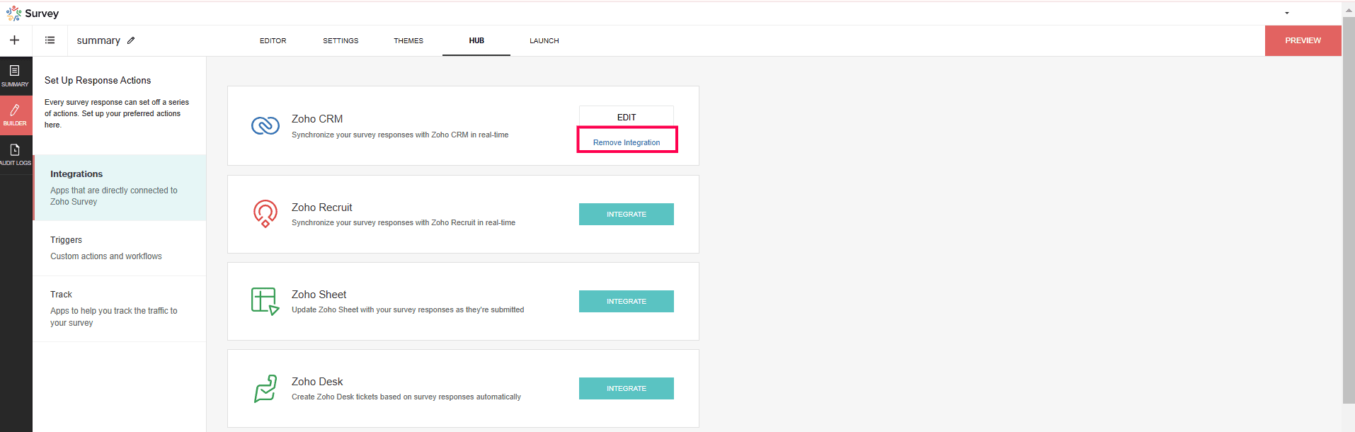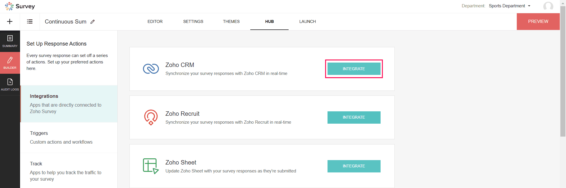 Navigate to the Hub>Integrations from survey builder, then click INTEGRATE for Zoho CRM.