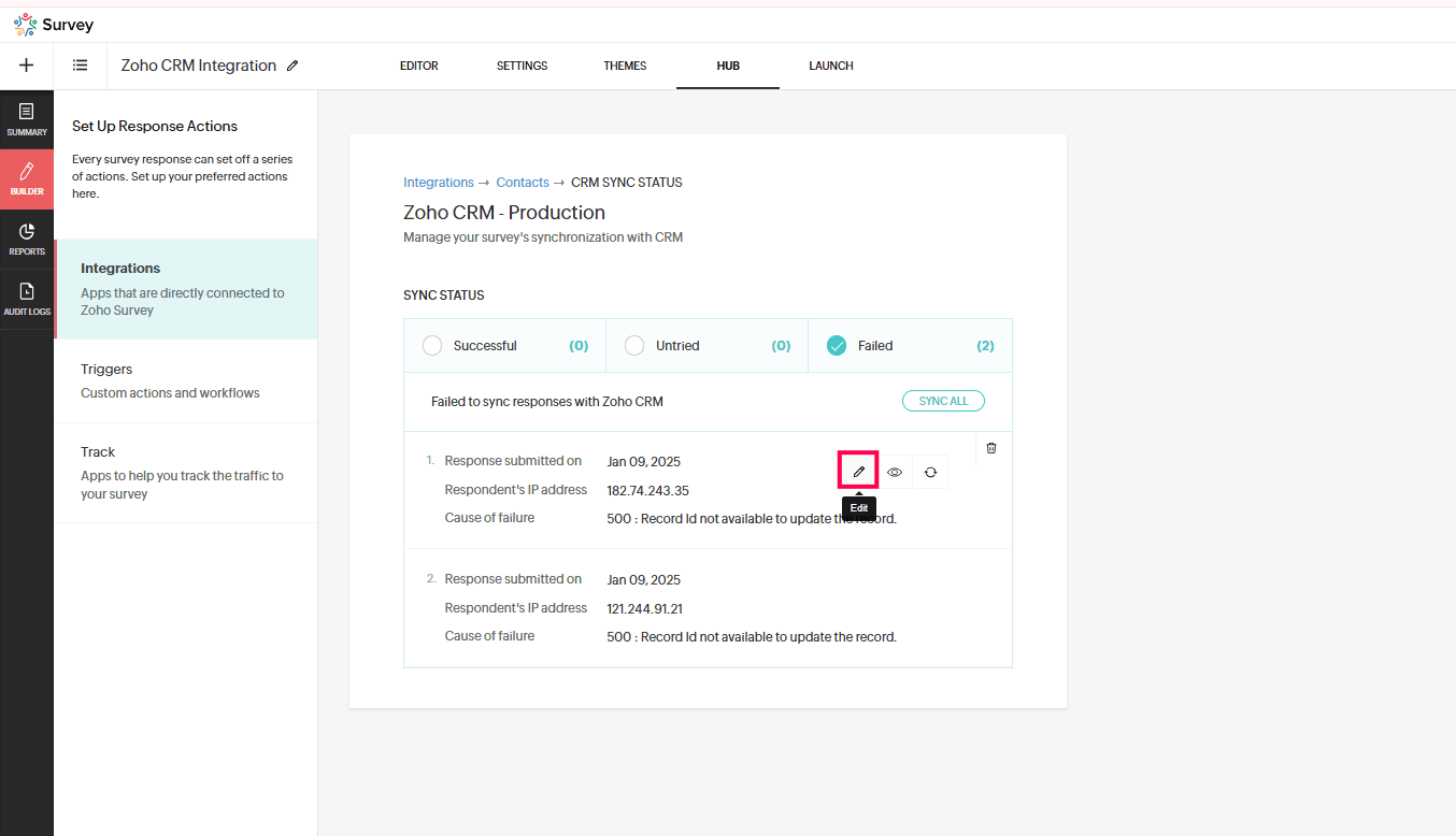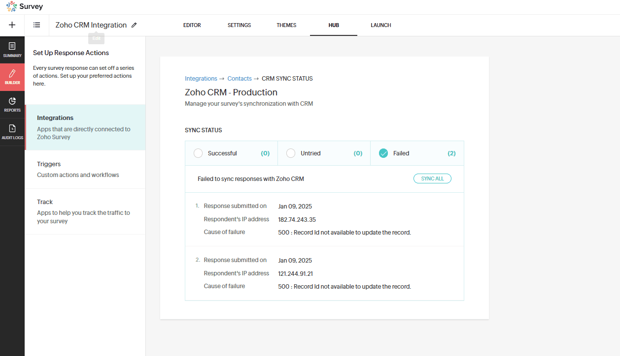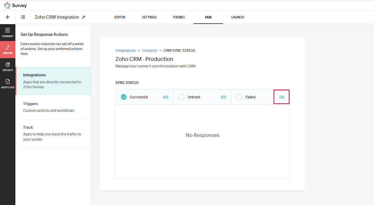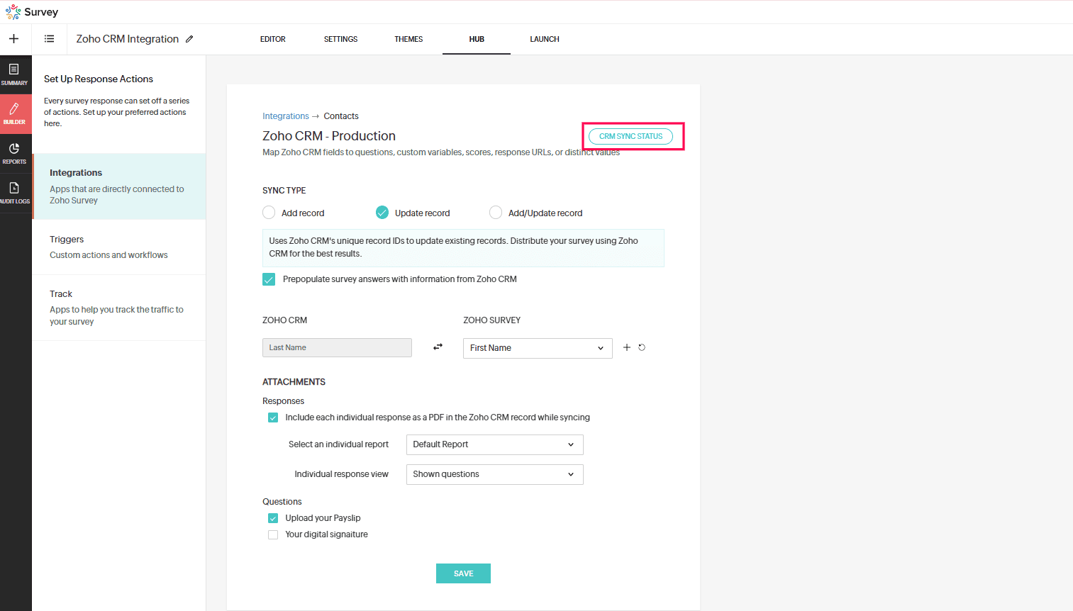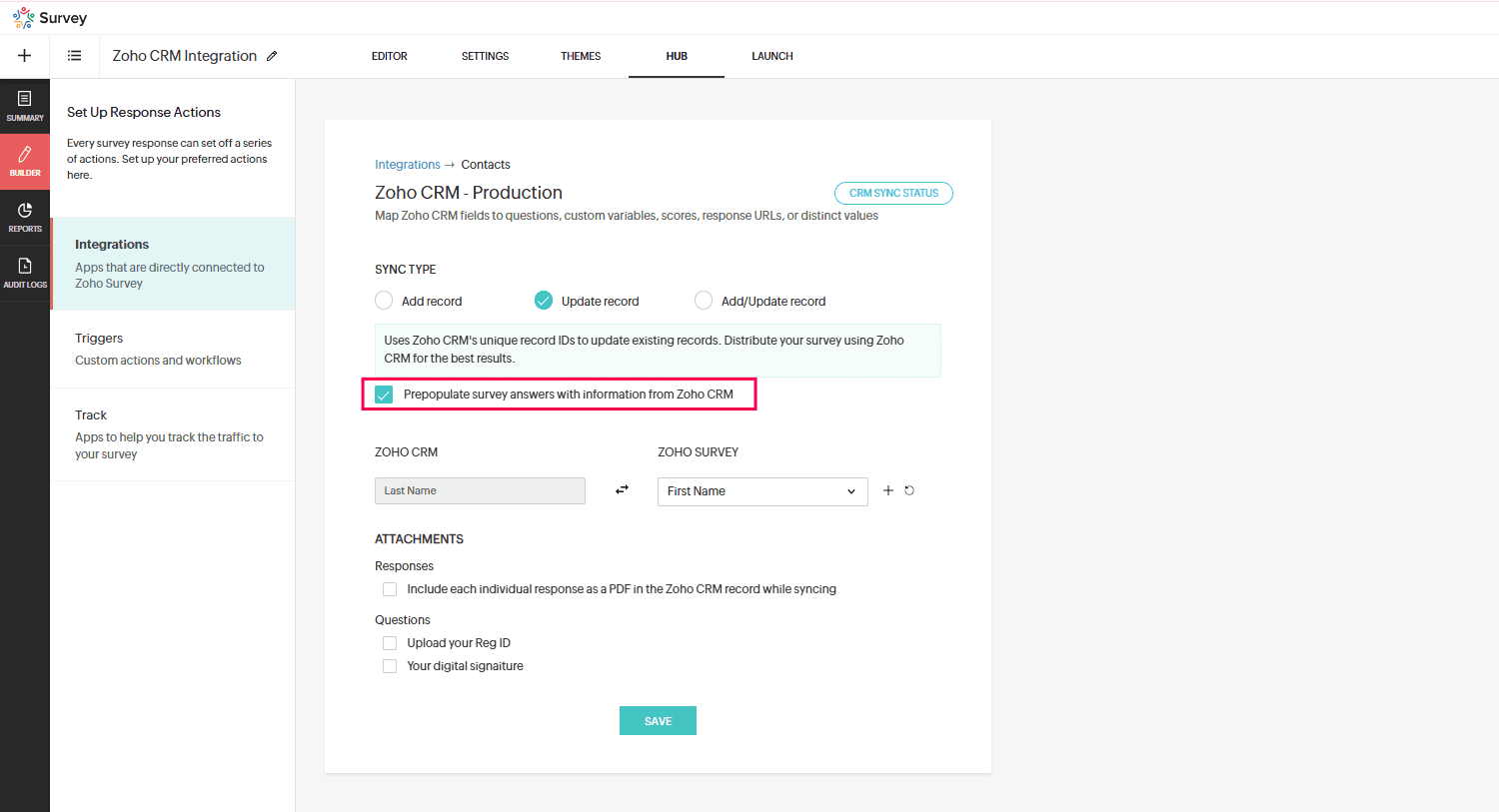 - If a survey is integrated with Zoho CRM before publishing, all of the responses will be synced automatically. If it's integrated after publishing, only the responses received after the integration will be synced. Update previous responses manually.