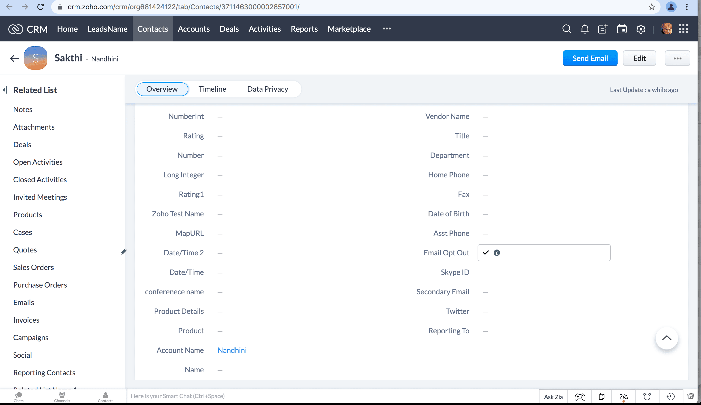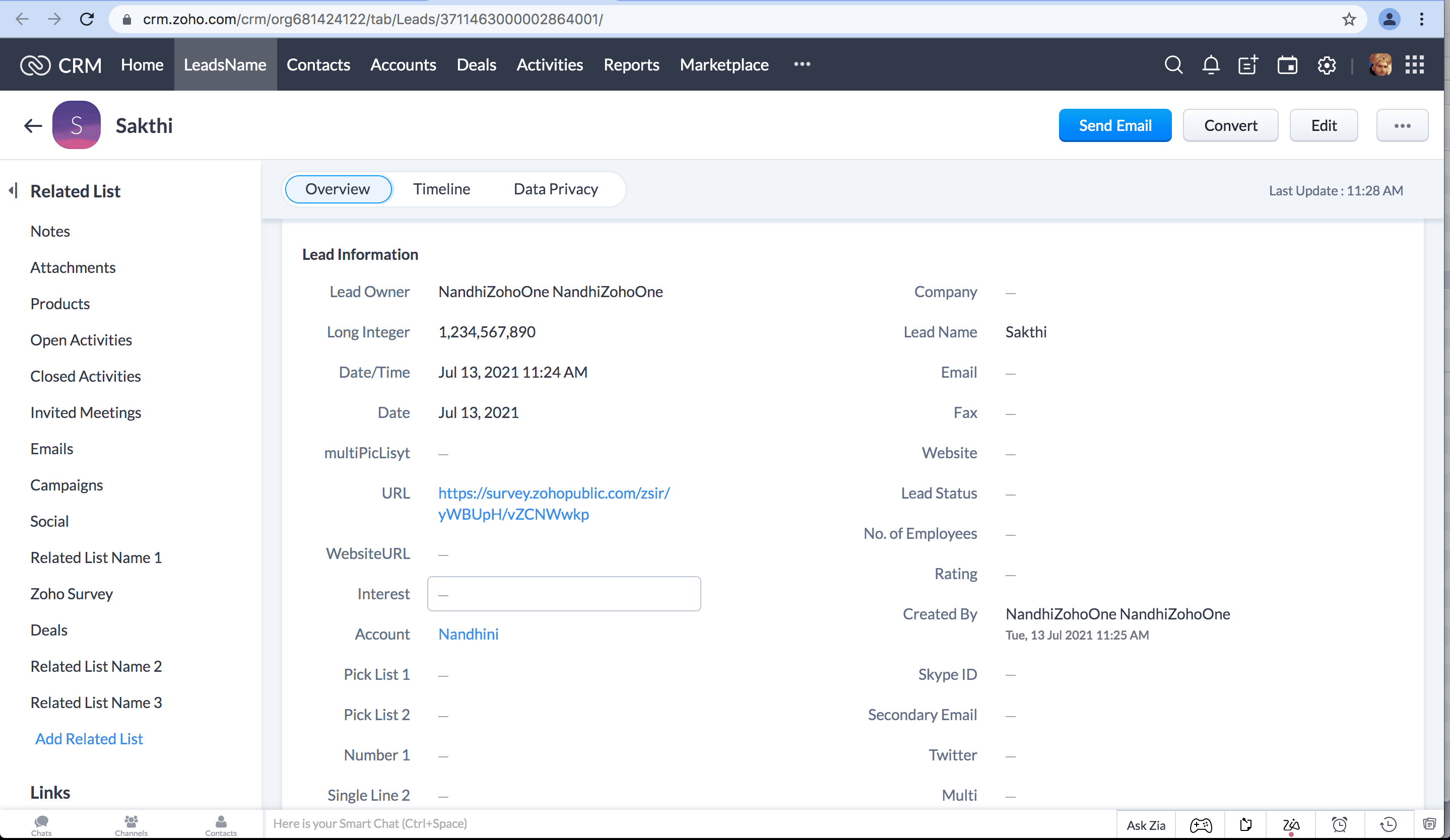 The Update record action allows you to update existing responses in Zoho CRM when a response is submitted in the survey form. This can be helpful in scenarios when an attendee wishes to retake the survey or provide fresh responses without creating duplicate CRM records.