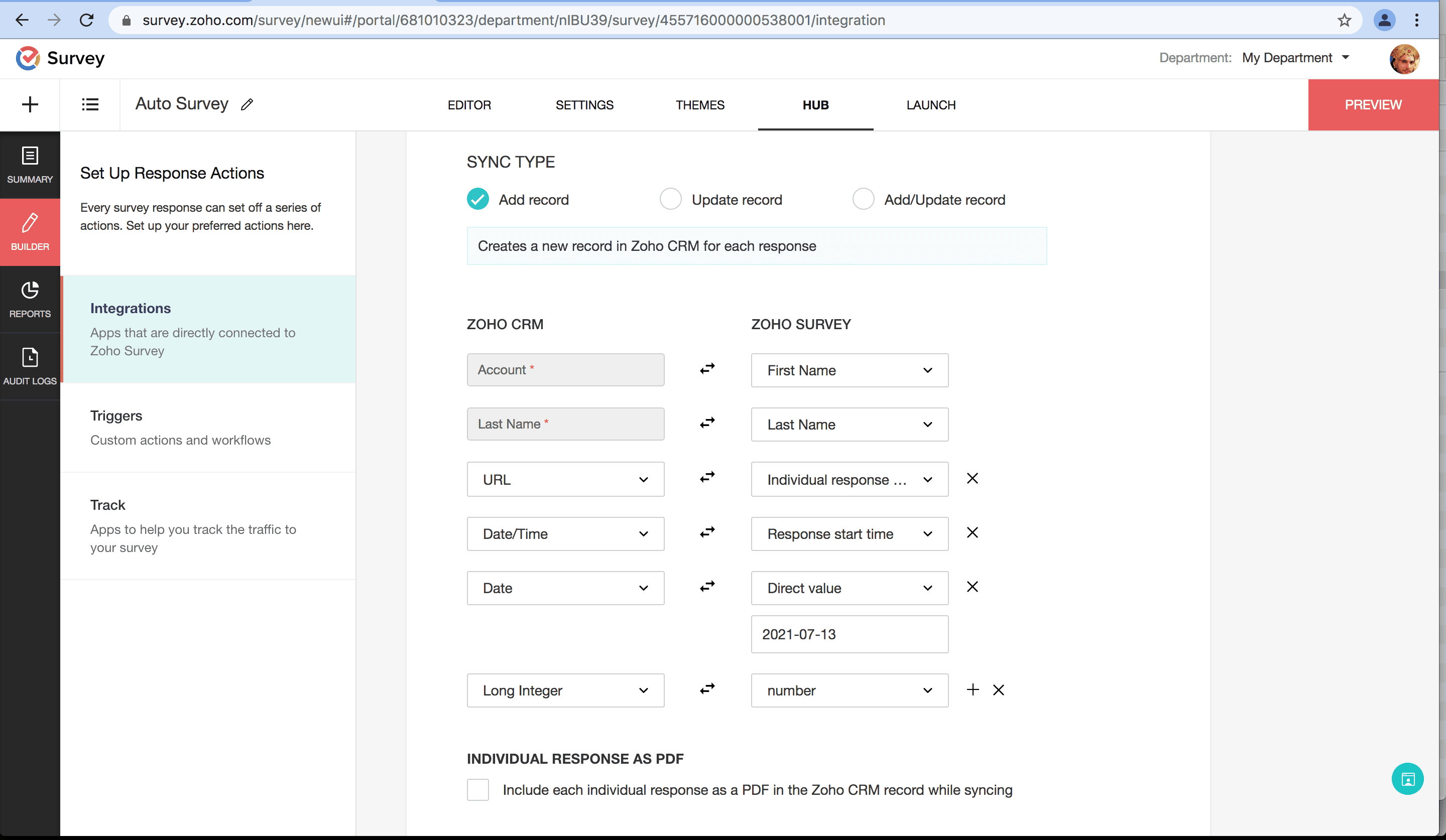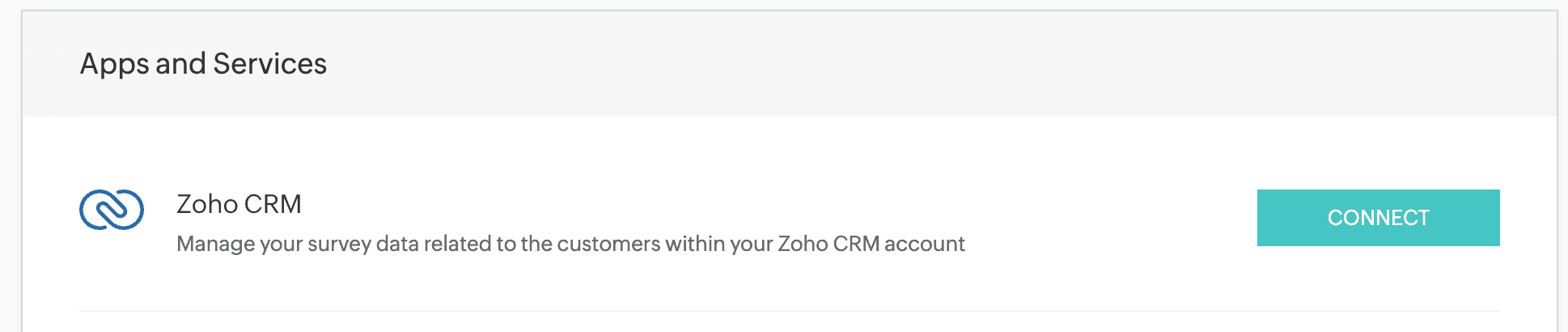 Integrating surveys with Zoho CRM helps synchronize all your survey responses within your CRM modules automatically. You can add survey links in CRM email templates and view the responses from your leads and contacts within Zoho CRM. You can also add and update records in CRM modules as soon as the survey responses are submitted to Zoho Survey. Read more on integrating Zoho Survey with Zoho CRM.