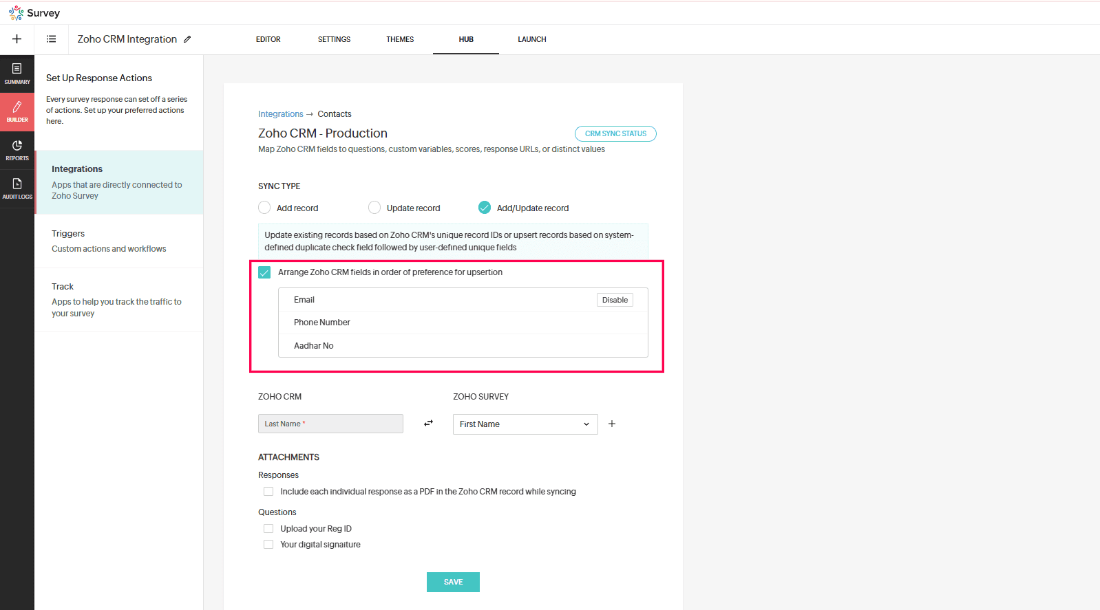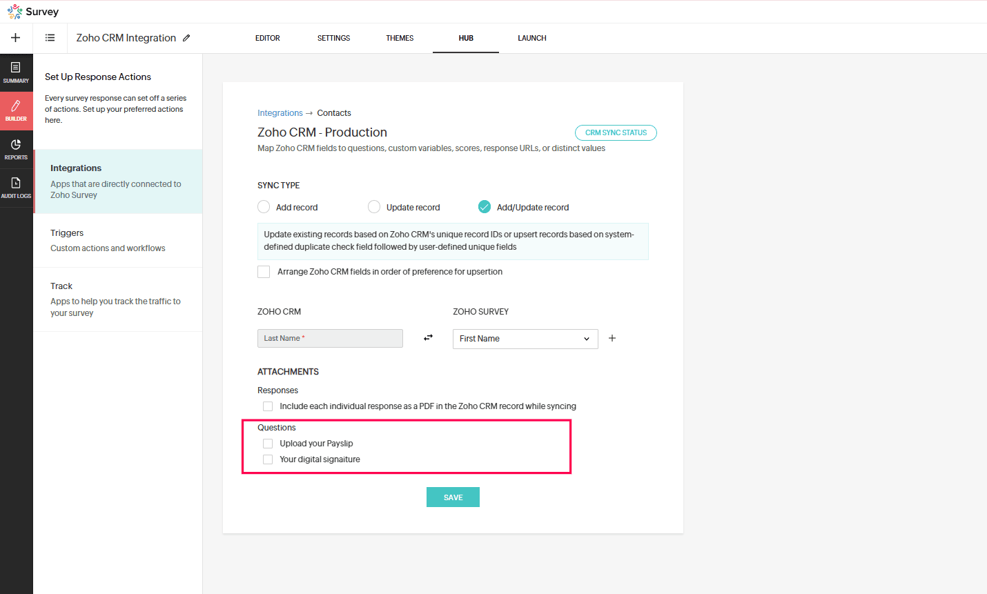 If you have a Signature or File Upload question in your survey, Zoho Survey gives you the capability to attach those file responses to CRM. To enable it, follow the steps below: