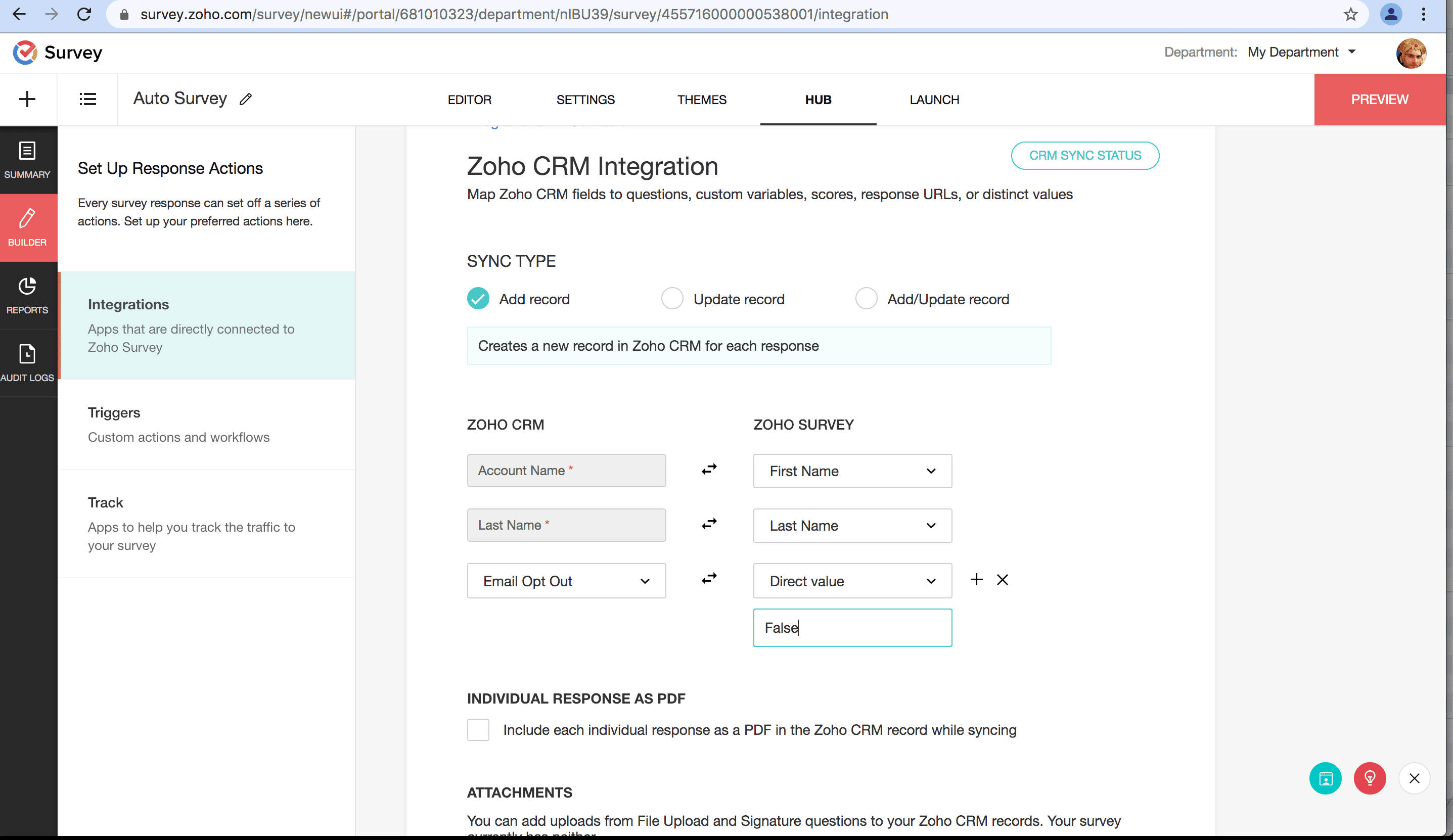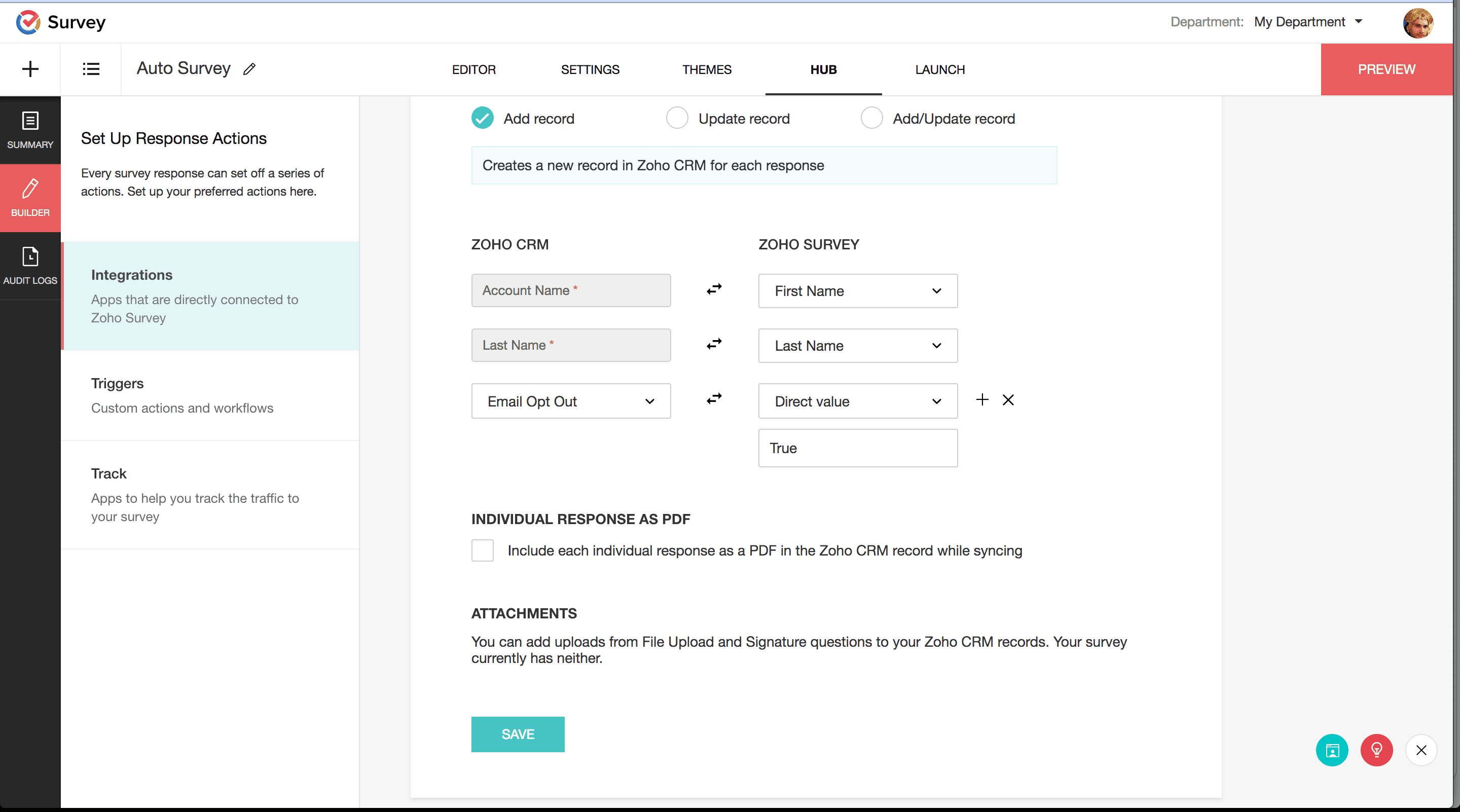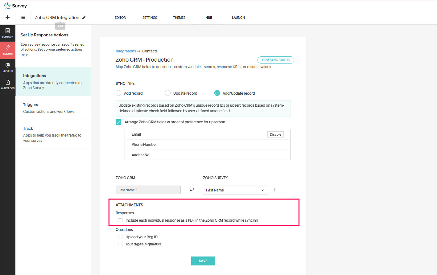 Zoho Survey gives you the capability to attach individual responses as PDF in CRM. To enable it, follow the steps below: