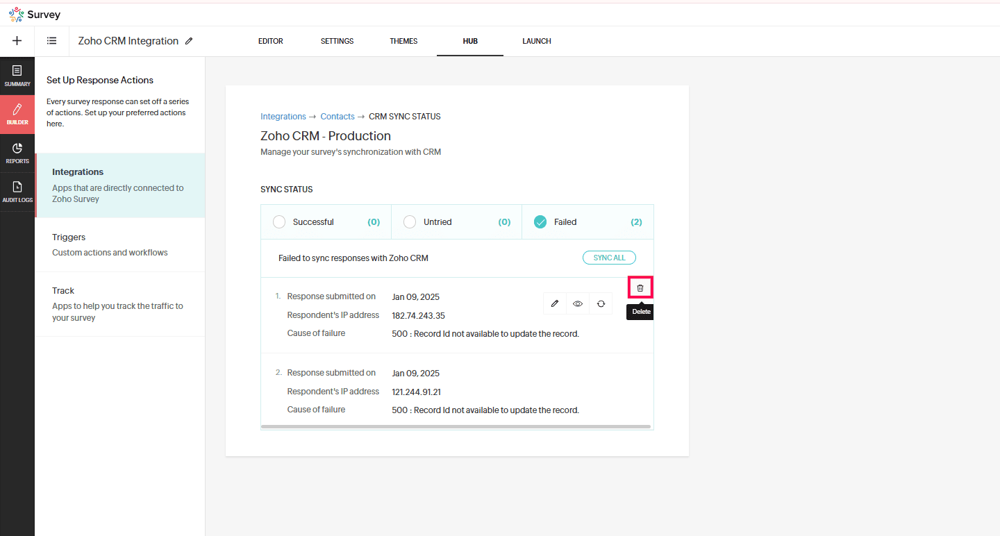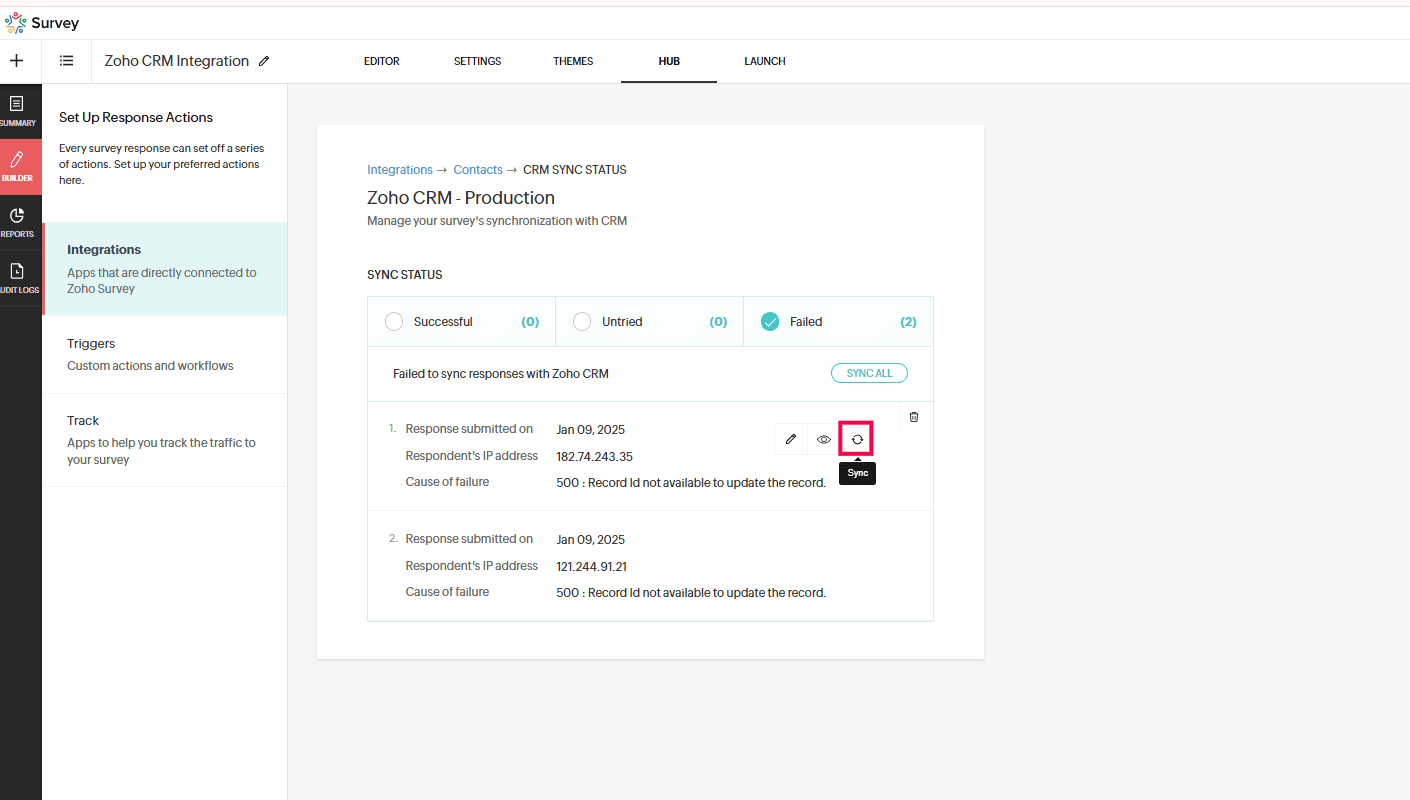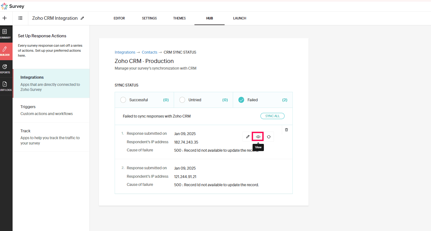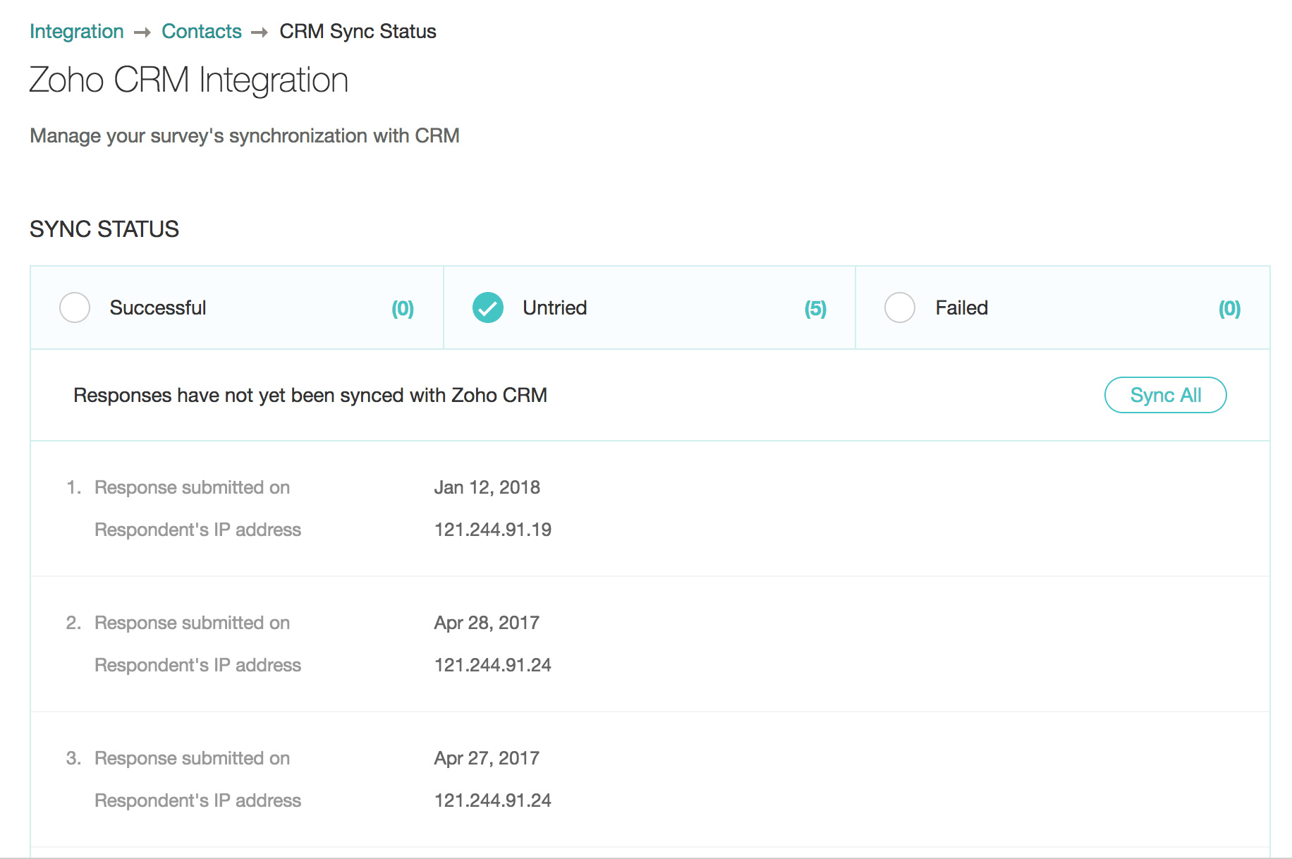 The sync status shows when the response was submitted and the IP address from which it was submitted. Corresponding records will be created in the Zoho CRM module you selected during the integration.