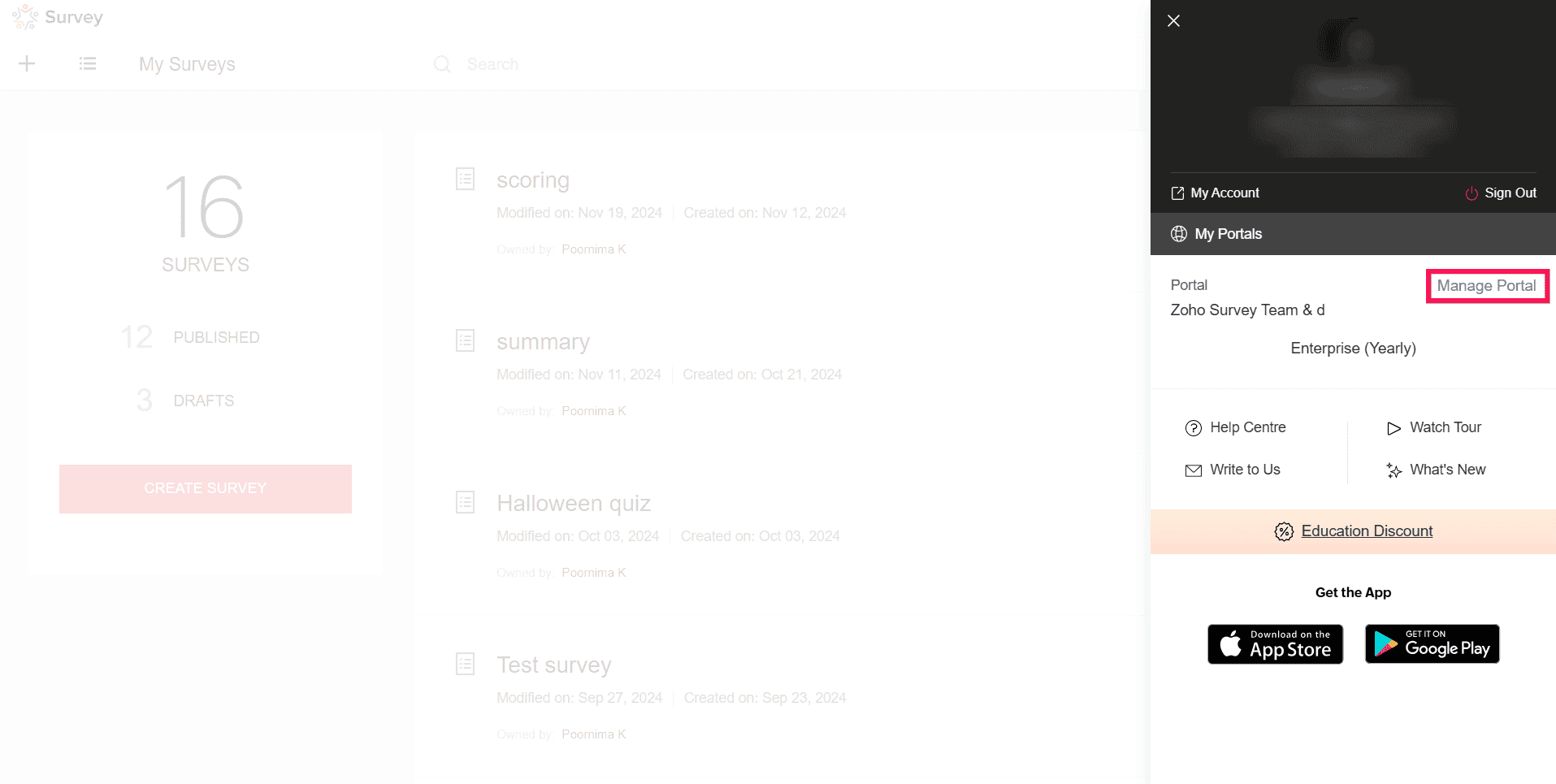 Navigate to your Profile in the top-right corner, then select Manage Portal.