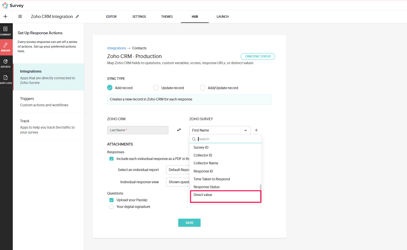 You can add direct values to your CRM field using the Direct value field under Zoho Survey. Type in the corresponding value. If you don't have a suitable CRM field already, create a custom field in Zoho CRM and then map the field to the question.