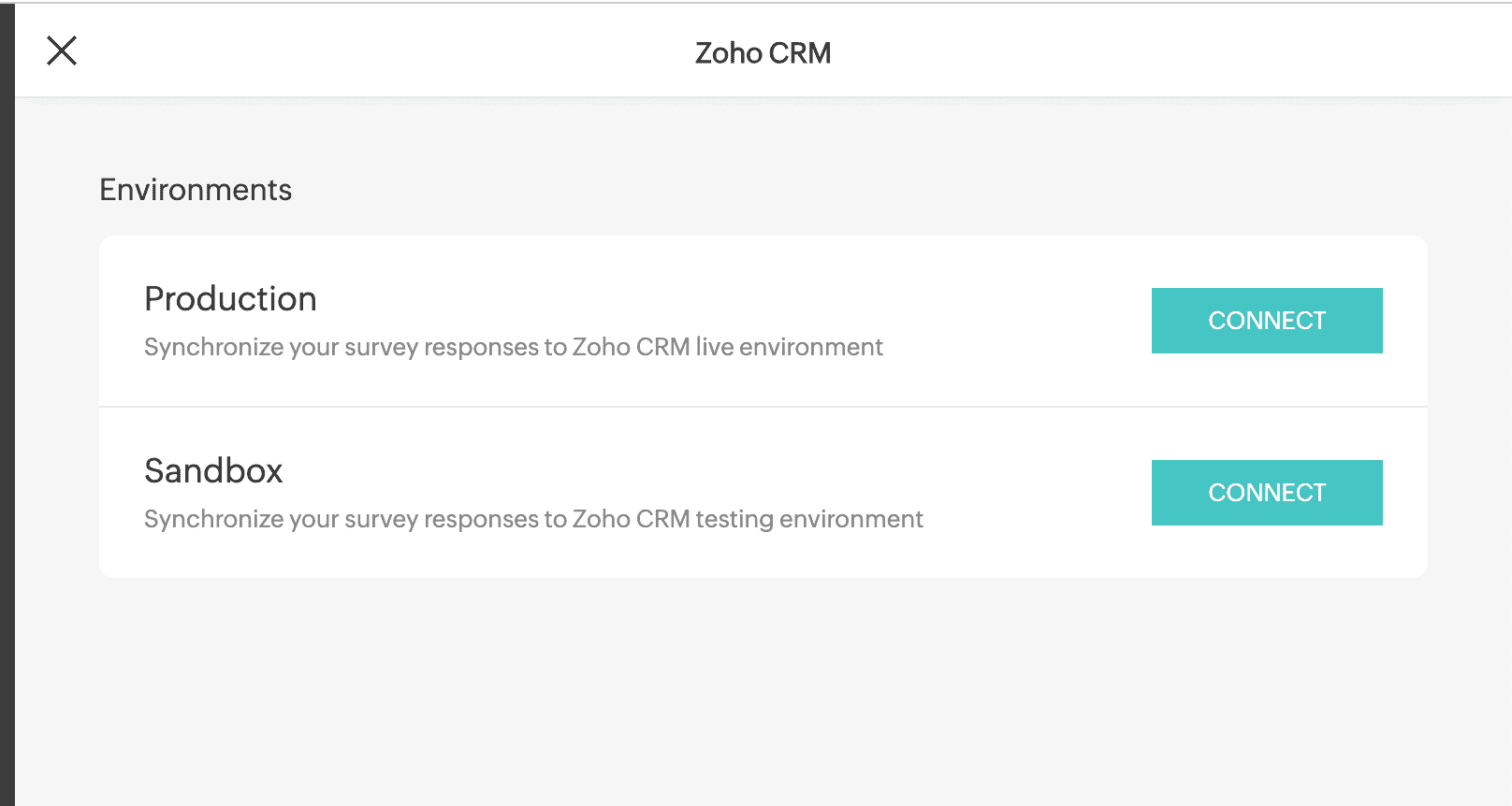 Click on Connect, then choose the environment accustomed to Zoho CRM.