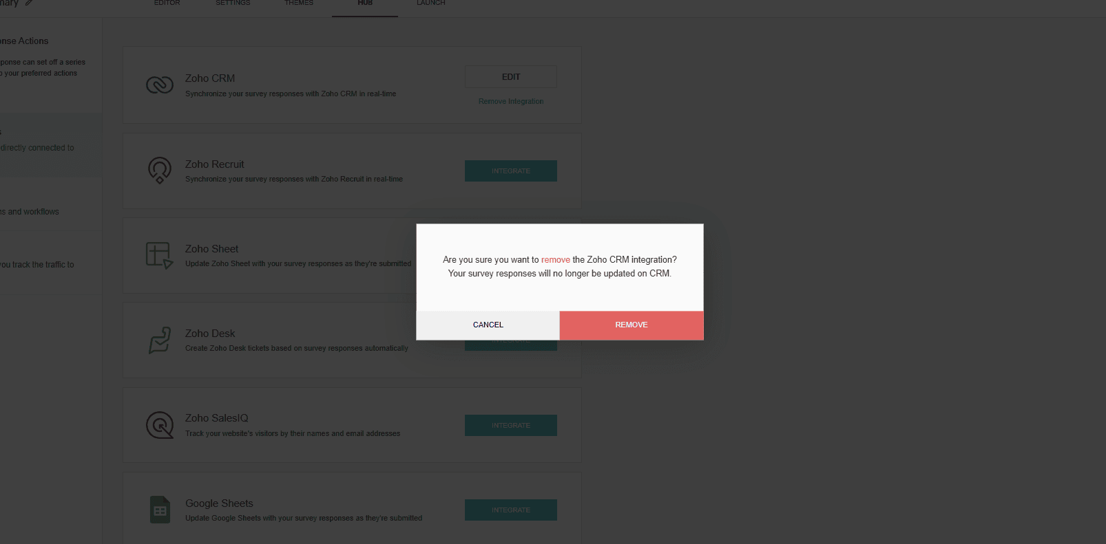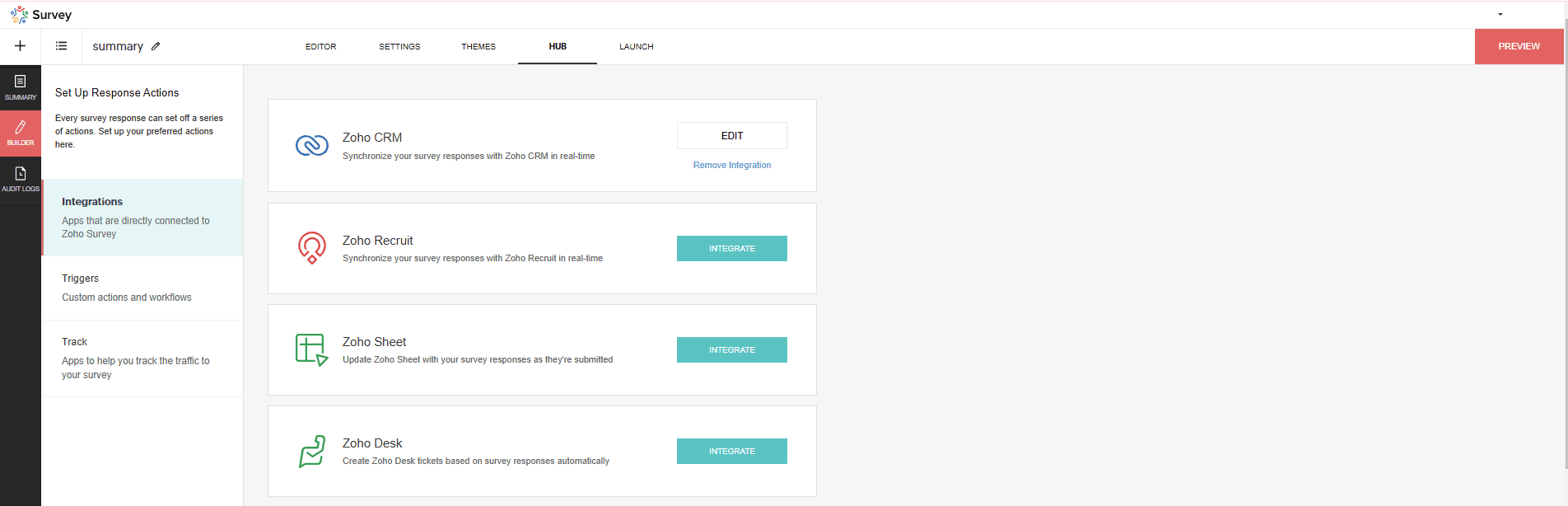 Navigate to the Hub>Integrations from survey builder, and click on INTEGRATE for Zoho CRM.