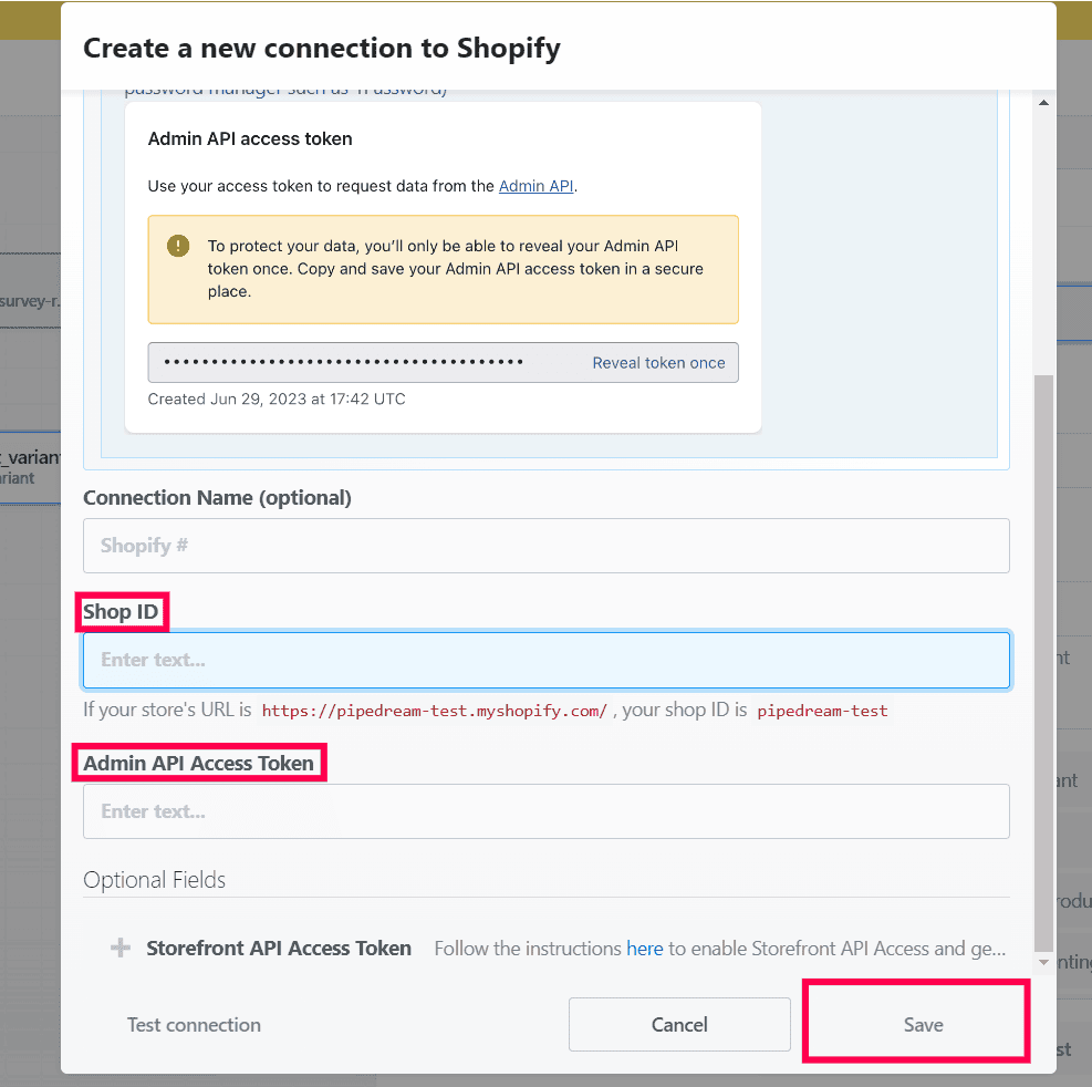 Enter the details like Shop ID, Admin API Access tokens, and other data in the optional fields, and click Save.