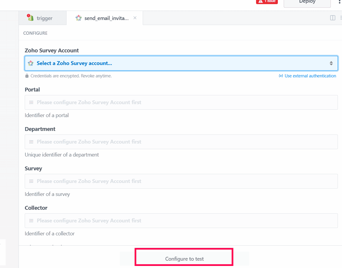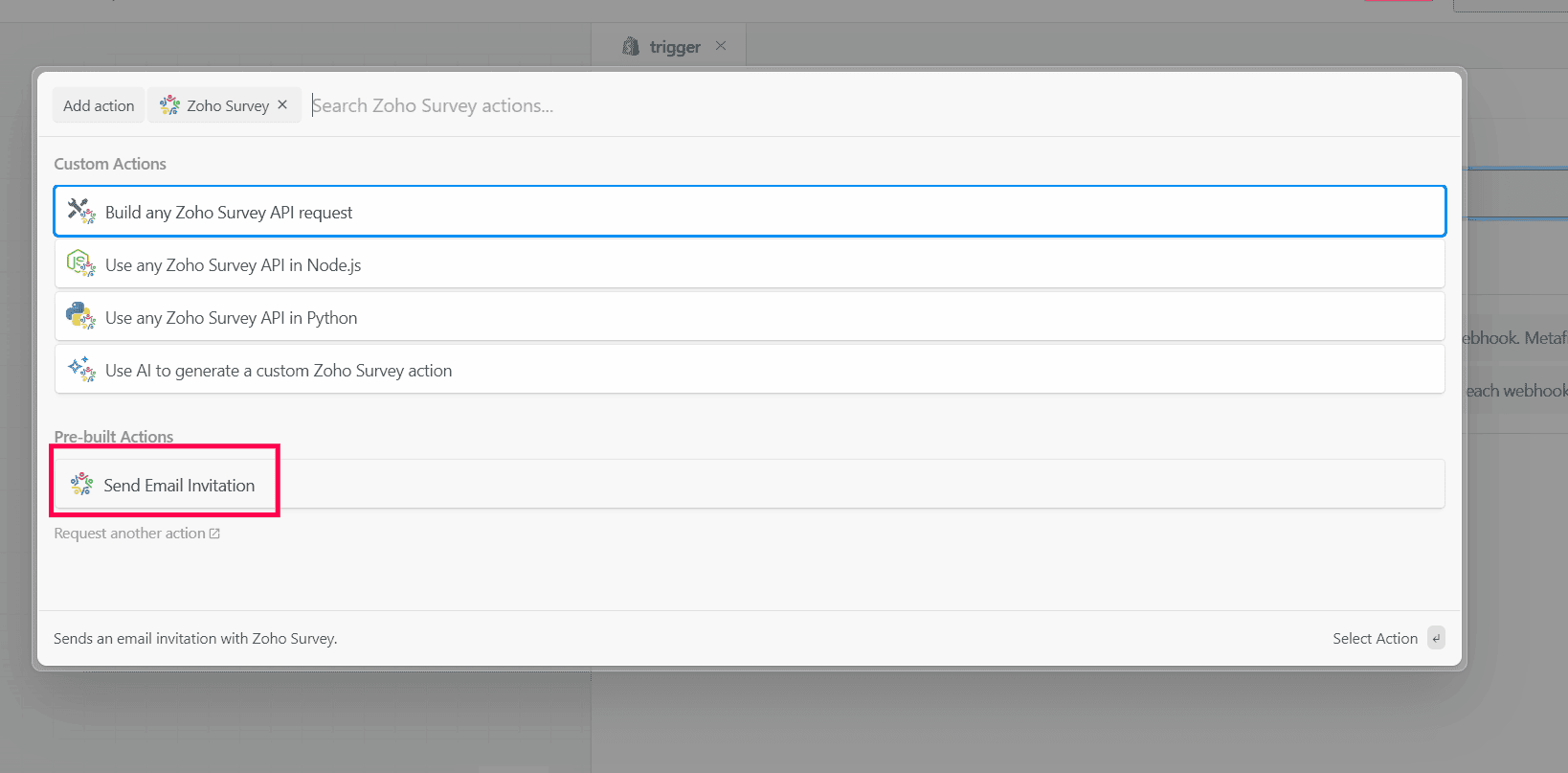 Whenever an action configured in Pipedream is performed, an email trigger from Zoho Survey will be initiated.
