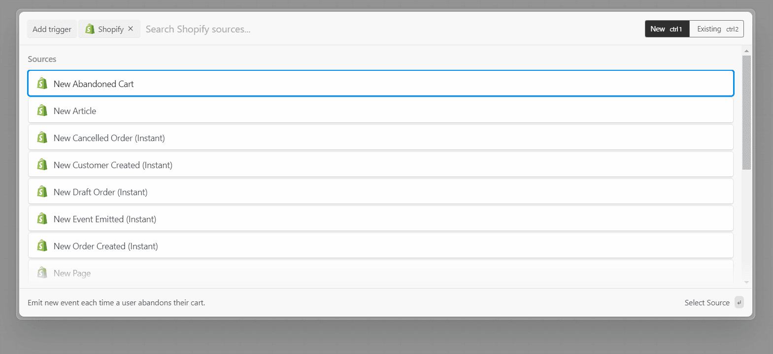 Upon choosing Shopify, a list of applicable triggers will be displayed.