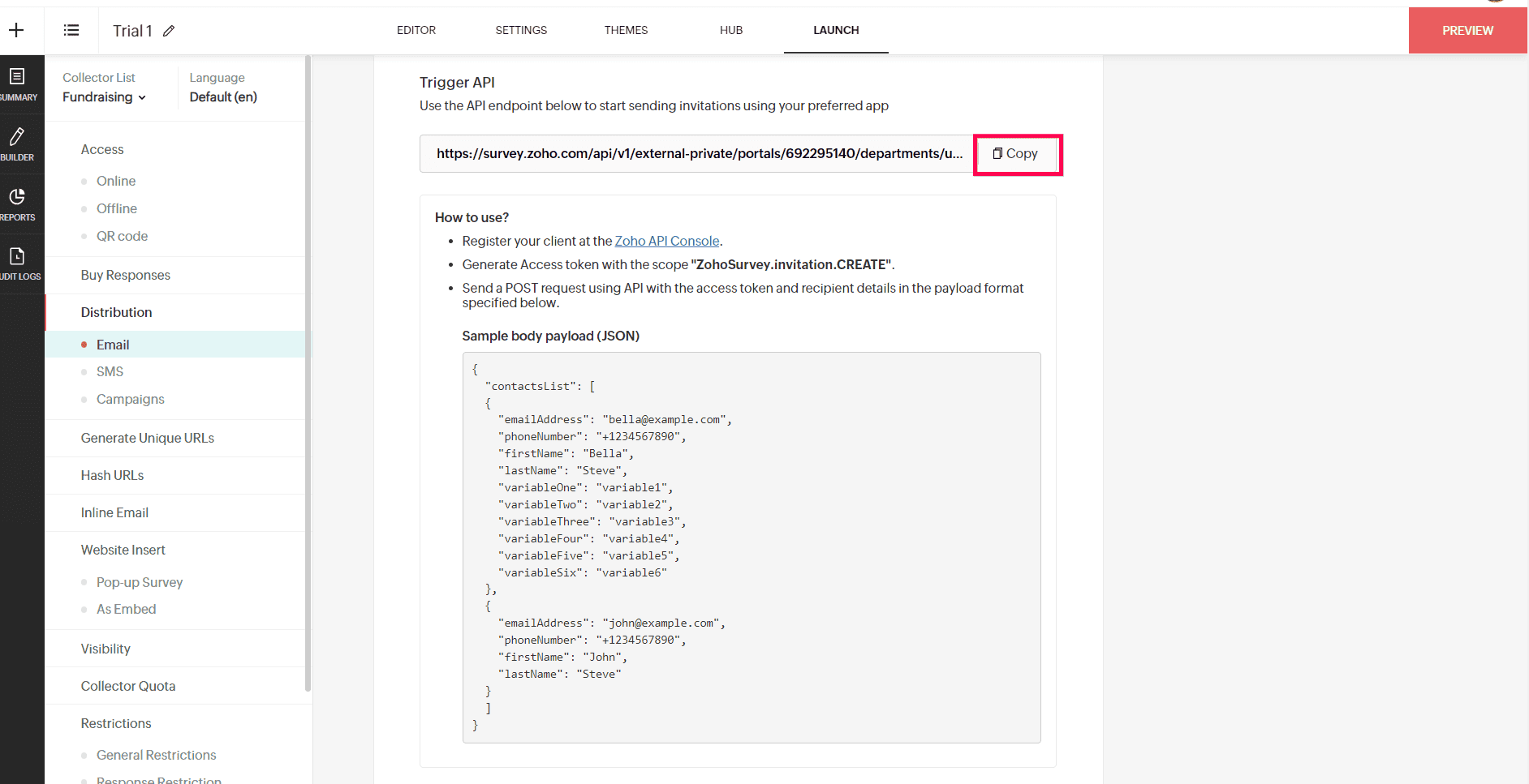 Enabling the Zoho Survey API allows you to automatically distribute surveys via email to your contacts. Any application can use trigger-based email distribution to send email invitations when an event occurs.