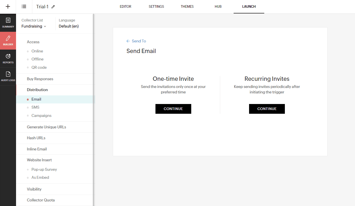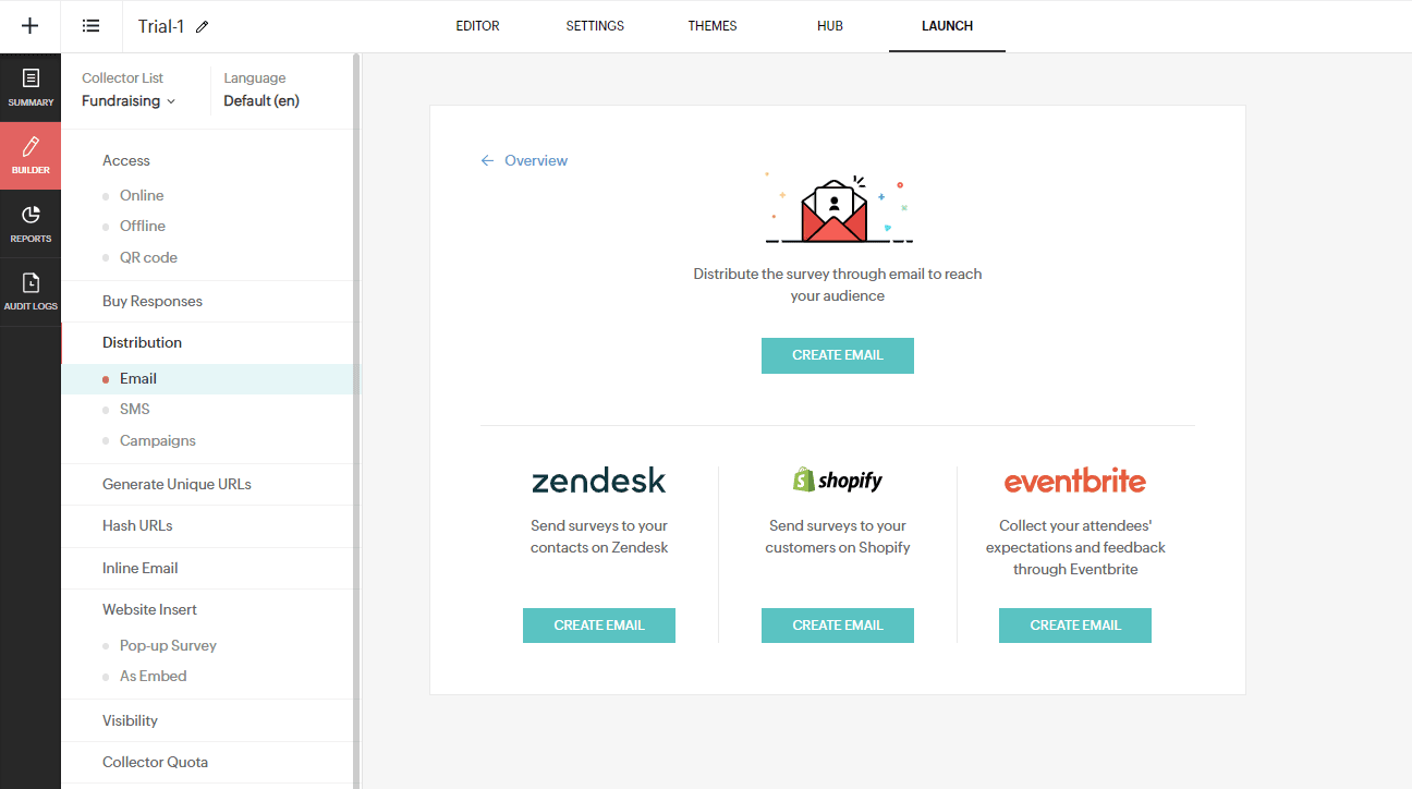 - In the Zoho Survey portal, navigate to the Launch tab, then click Create Email.