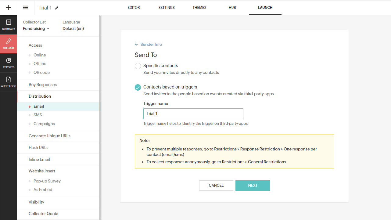 - In the Send To section, choose Contacts based on triggers and click Next.