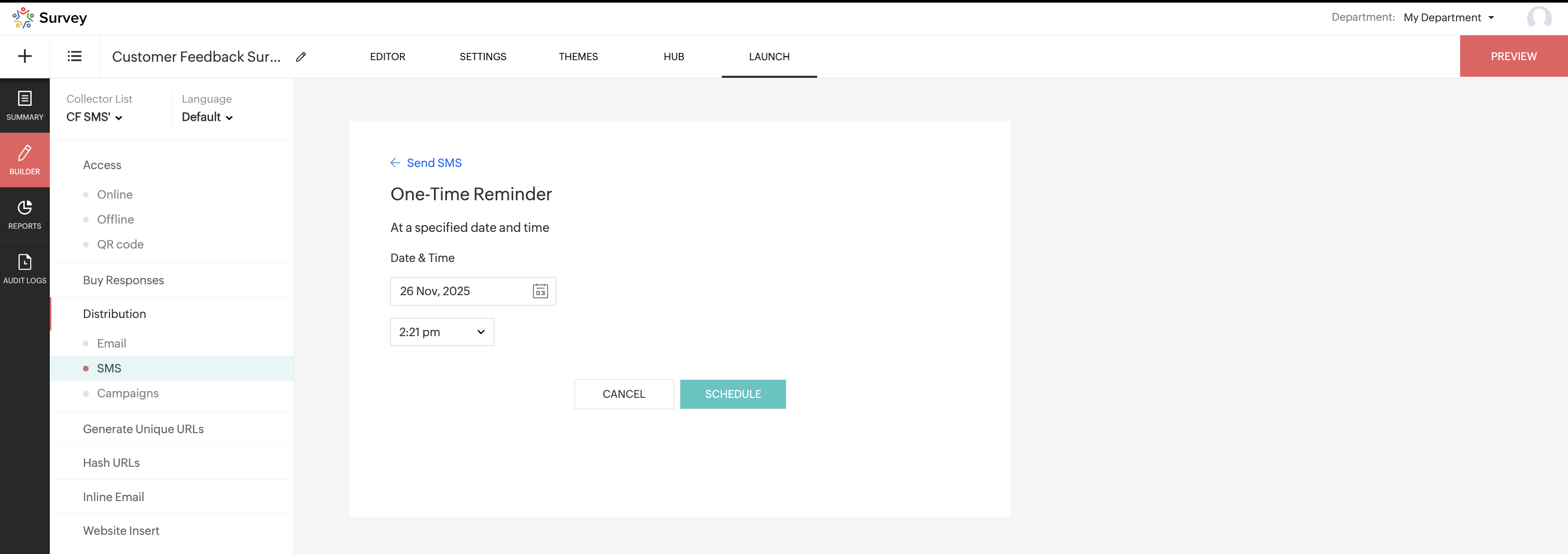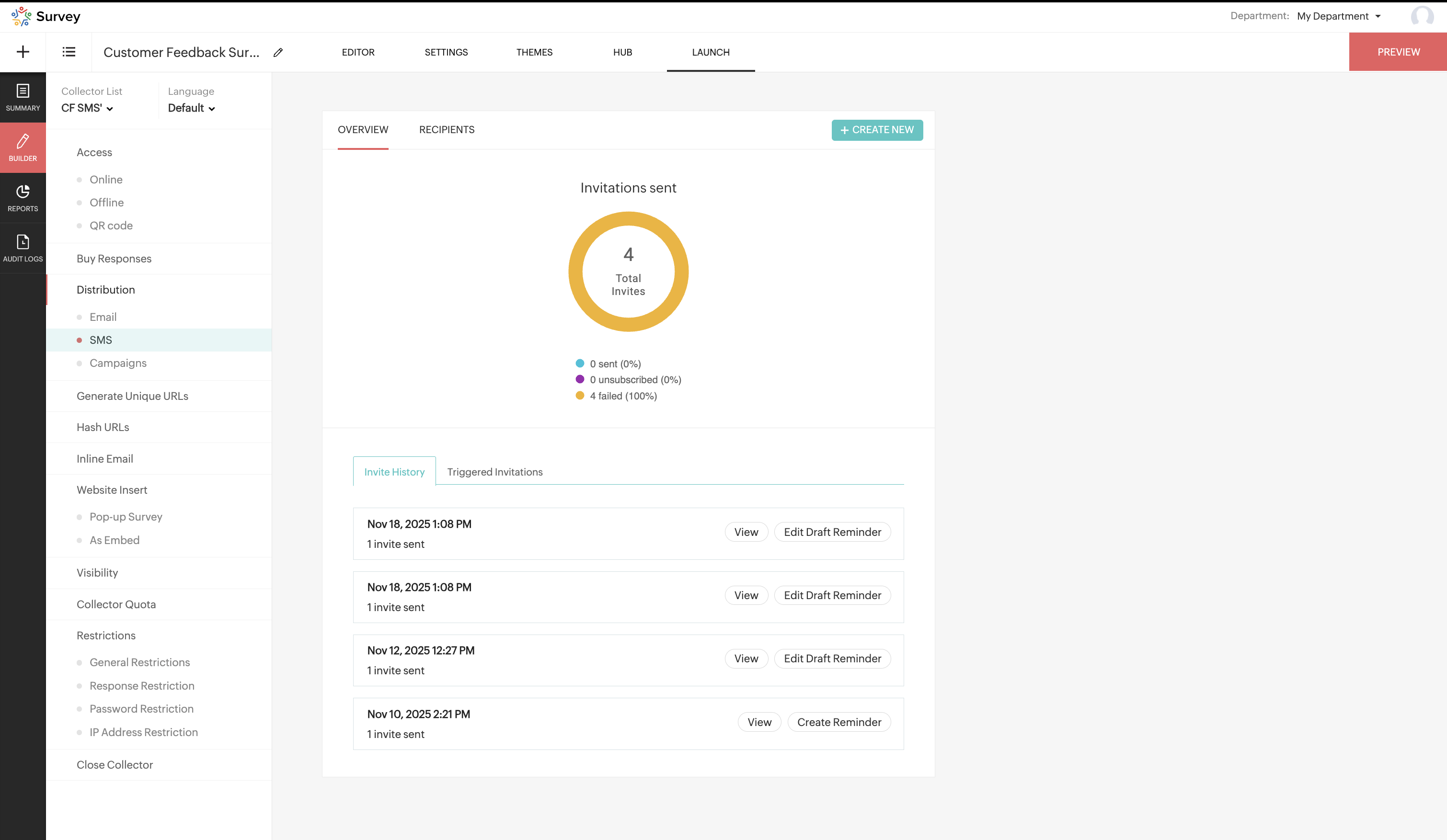 To edit a scheduled SMS invite: Go to the Launch tab. Under Distribution in the left pane, click SMS. You can only access this after you publish the survey. Click the next to the invitation you want to edit from the list of scheduled invites. Click ...