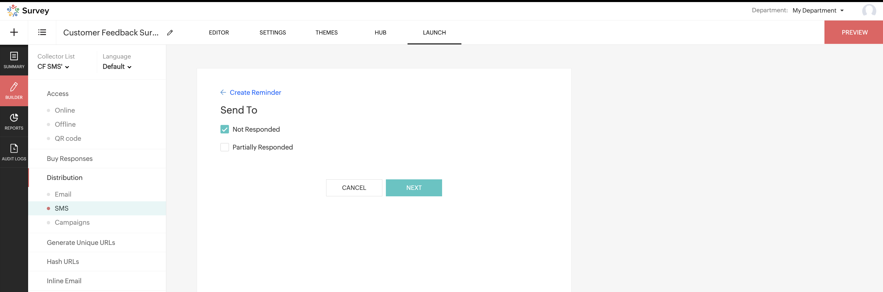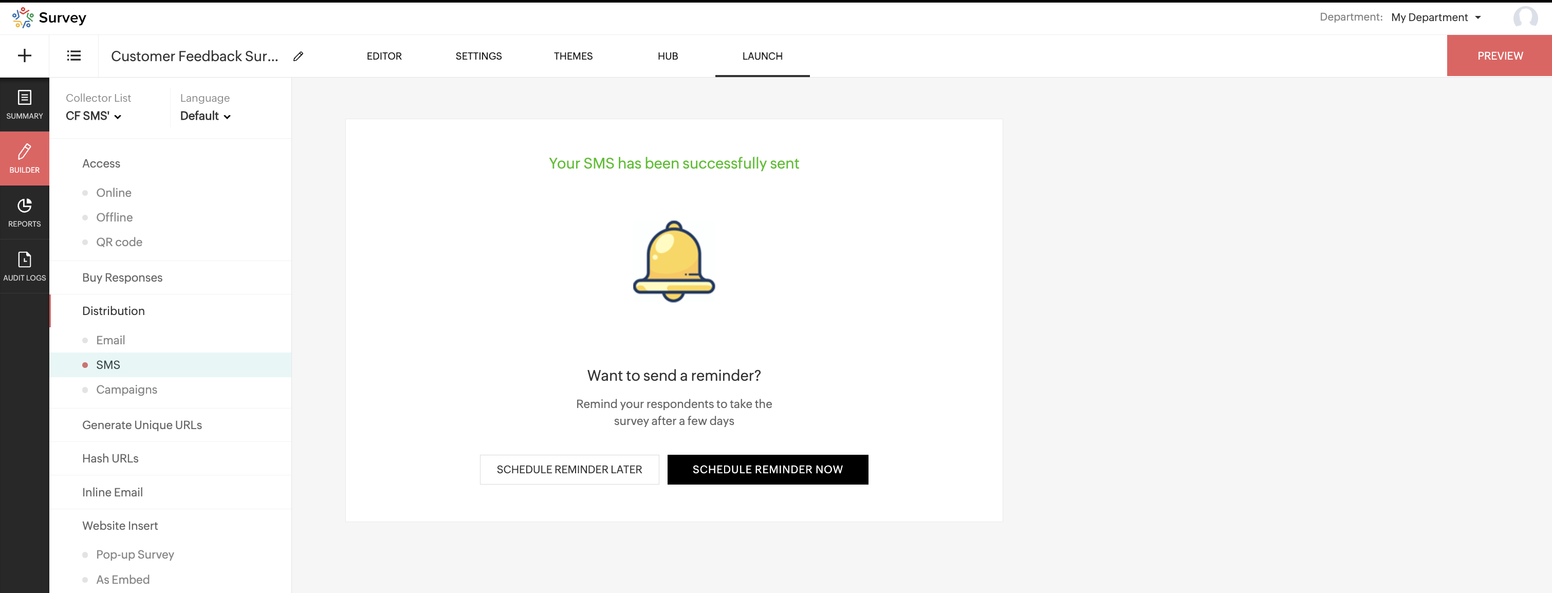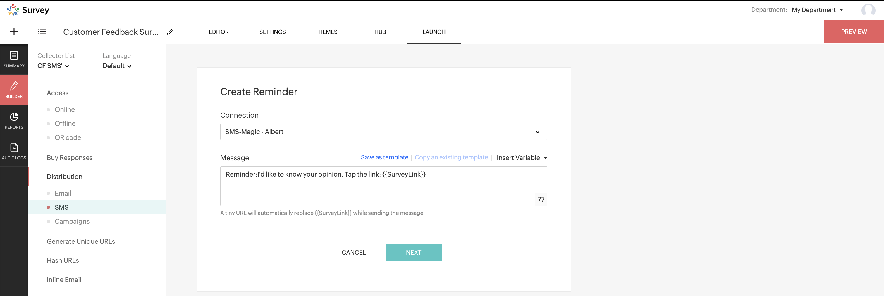 Follow the steps below to start sending surveys using SMS Distibution: For Zoho SMS service: Navigate to the Launch tab, and under Distribution in the left pane, click on the SMS icon. Then click on the Create SMS icon. In the Connection dropdown, ...