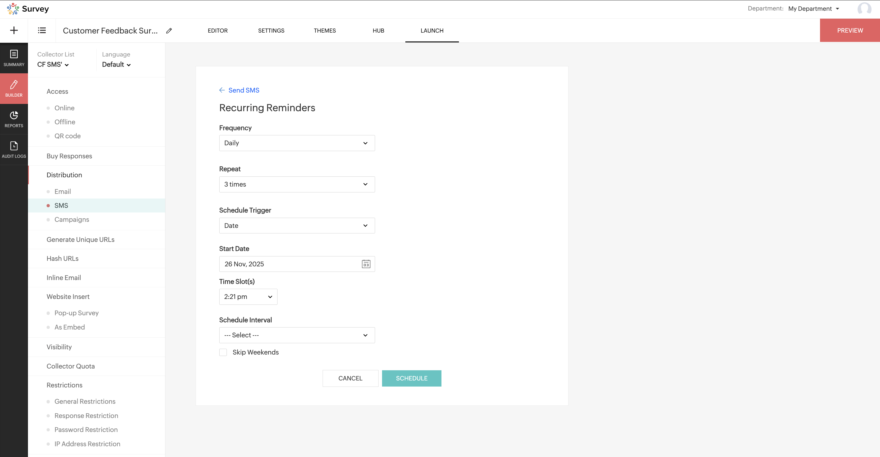 If you are selecting Recurring invite, set the Frequency, Repeat, Schedule Trigger, Start Date, Time Slot(s) and Schedule Interval. Then click Schedule.