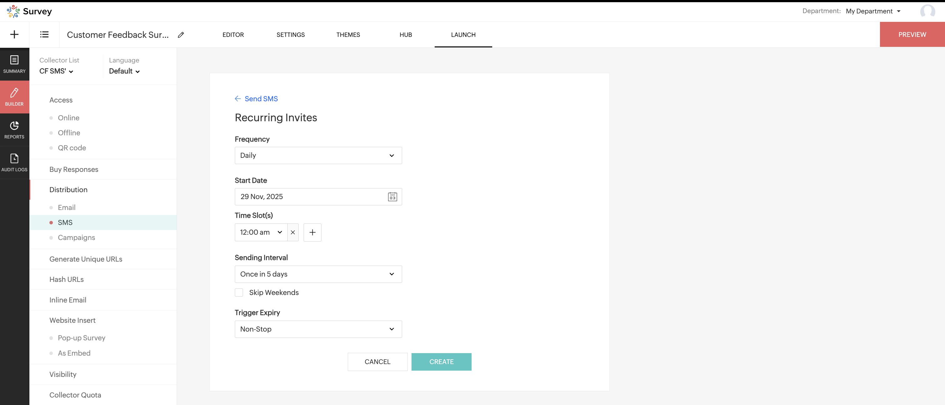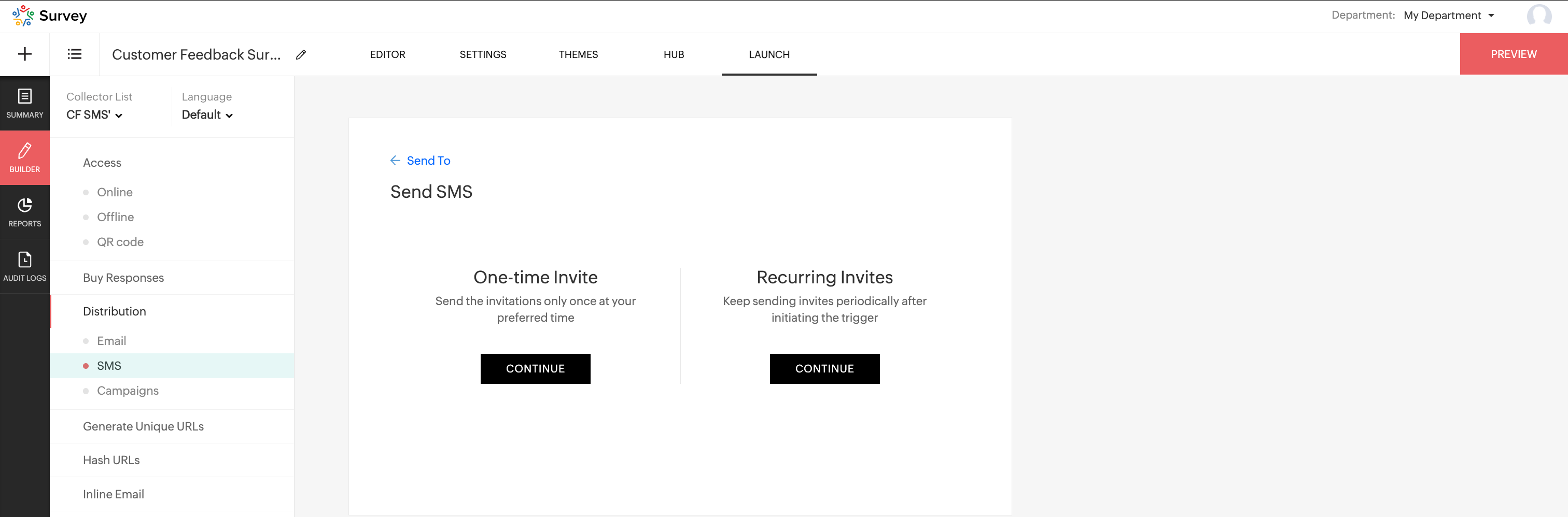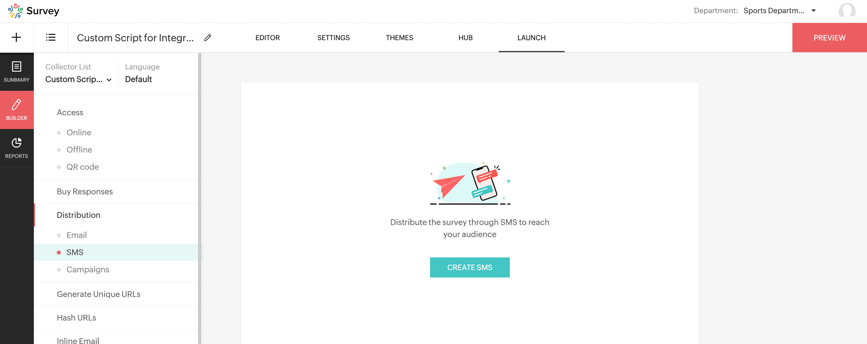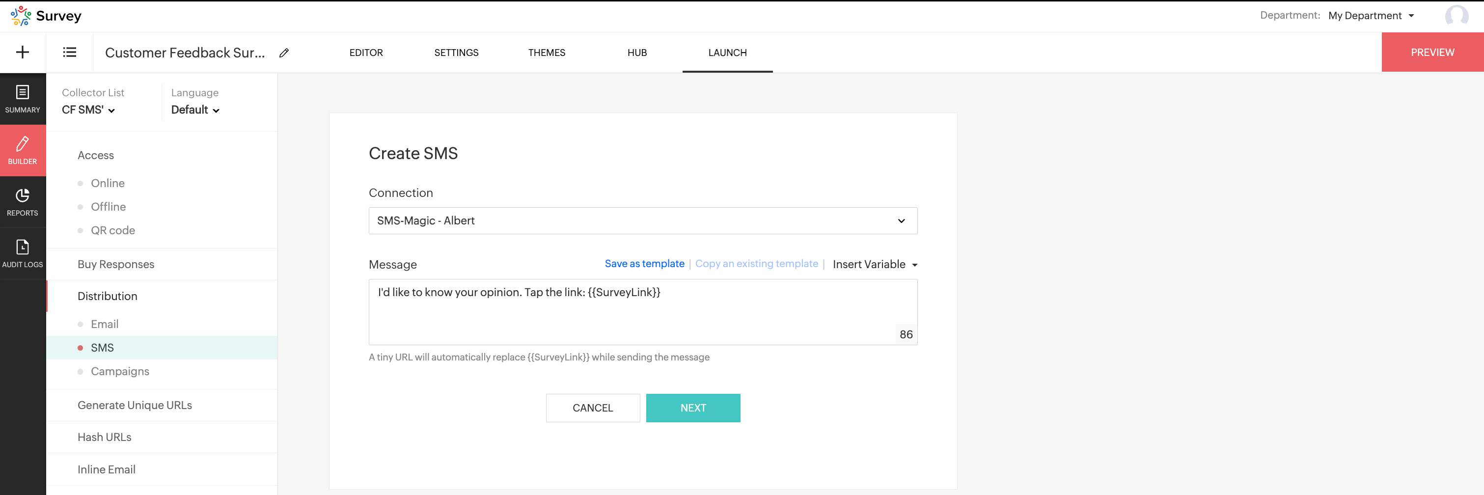 - In the Zoho Survey portal, navigate to the Launch tab, then click Create SMS.