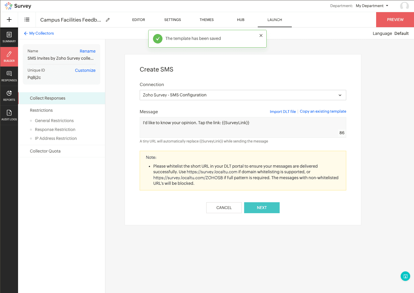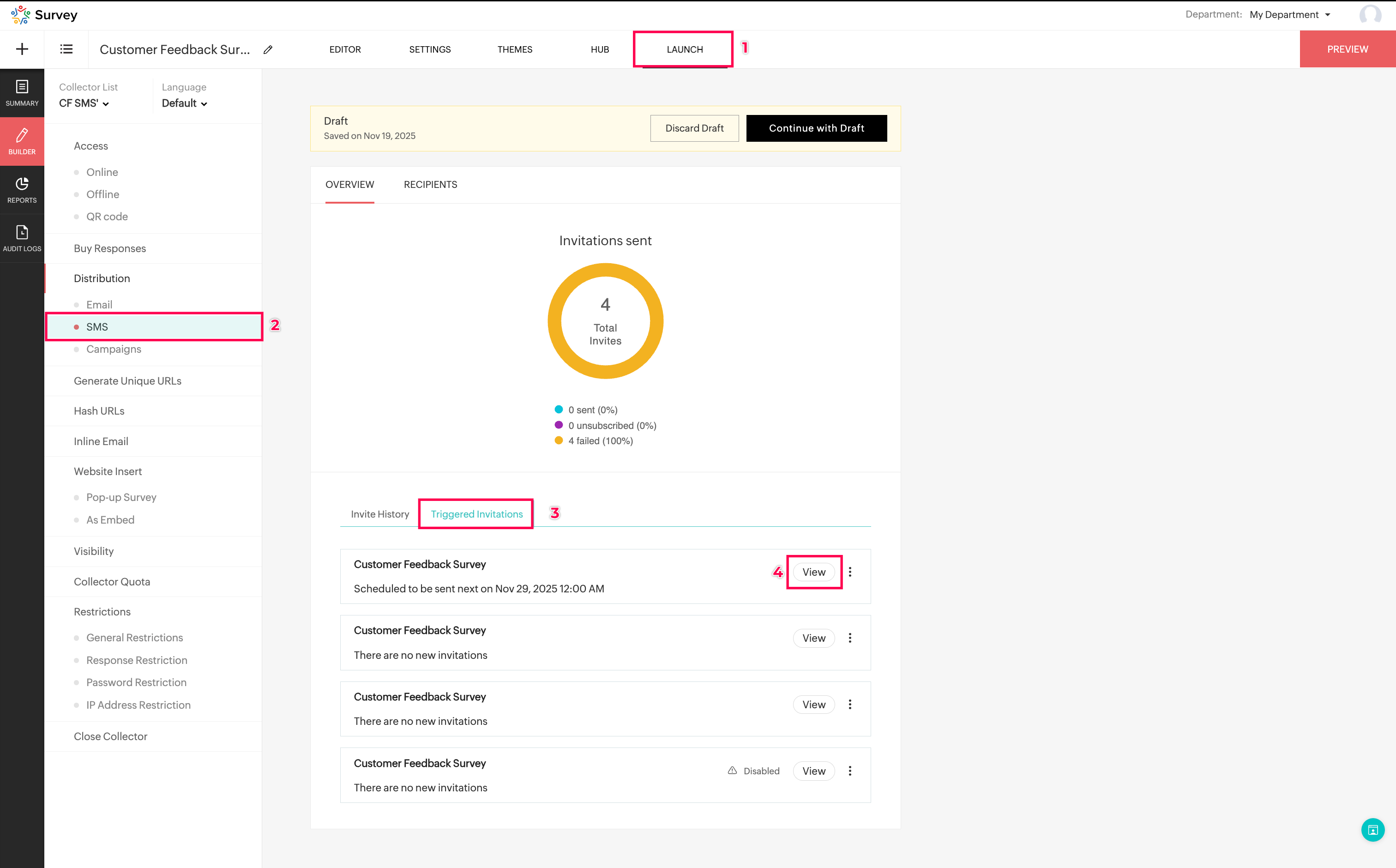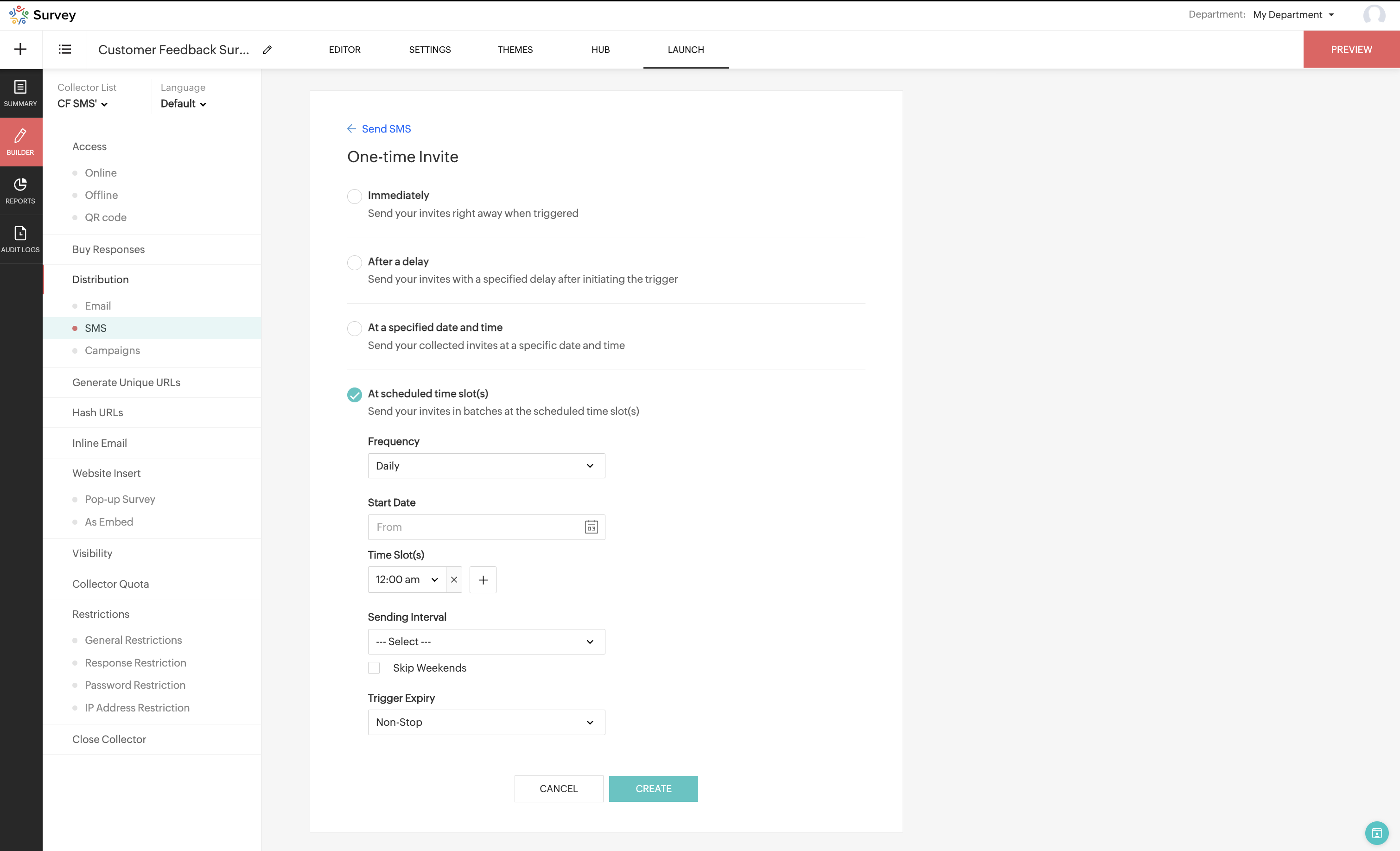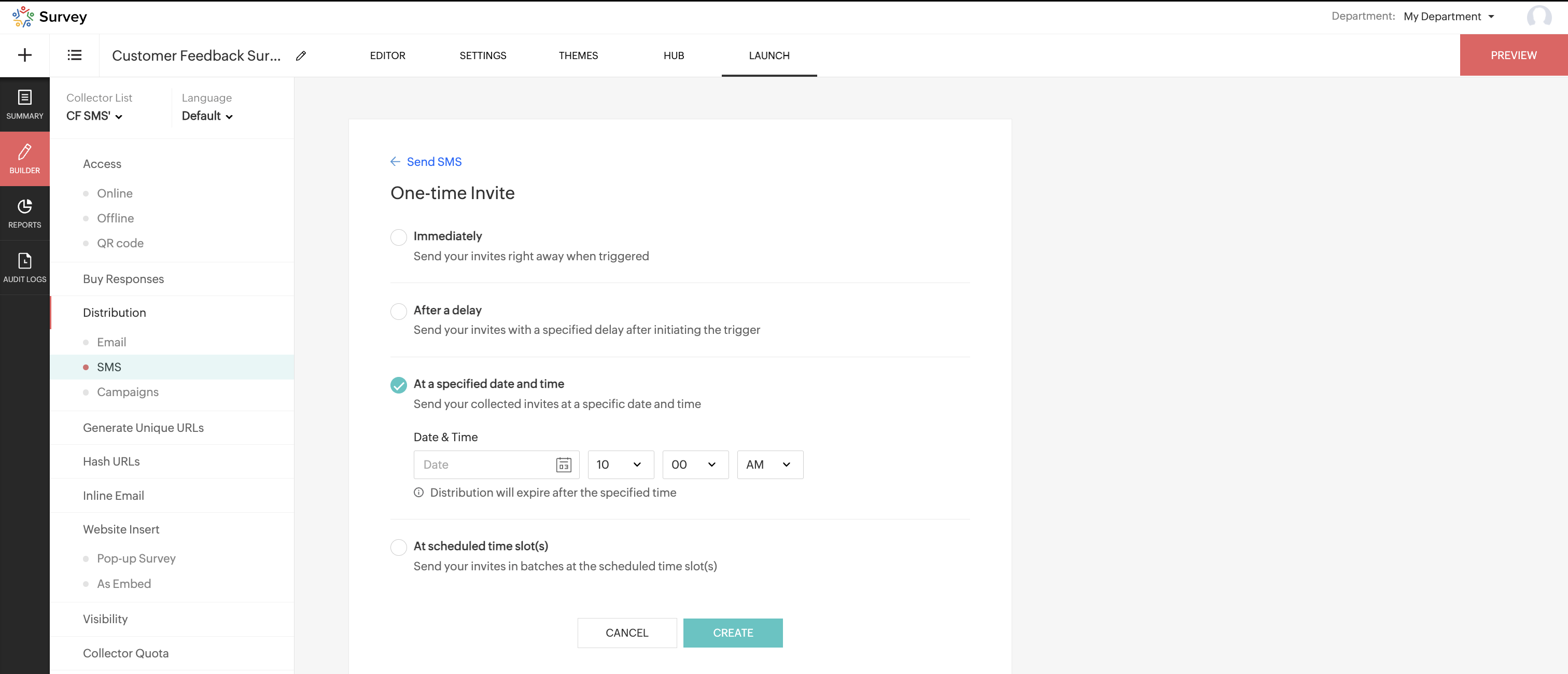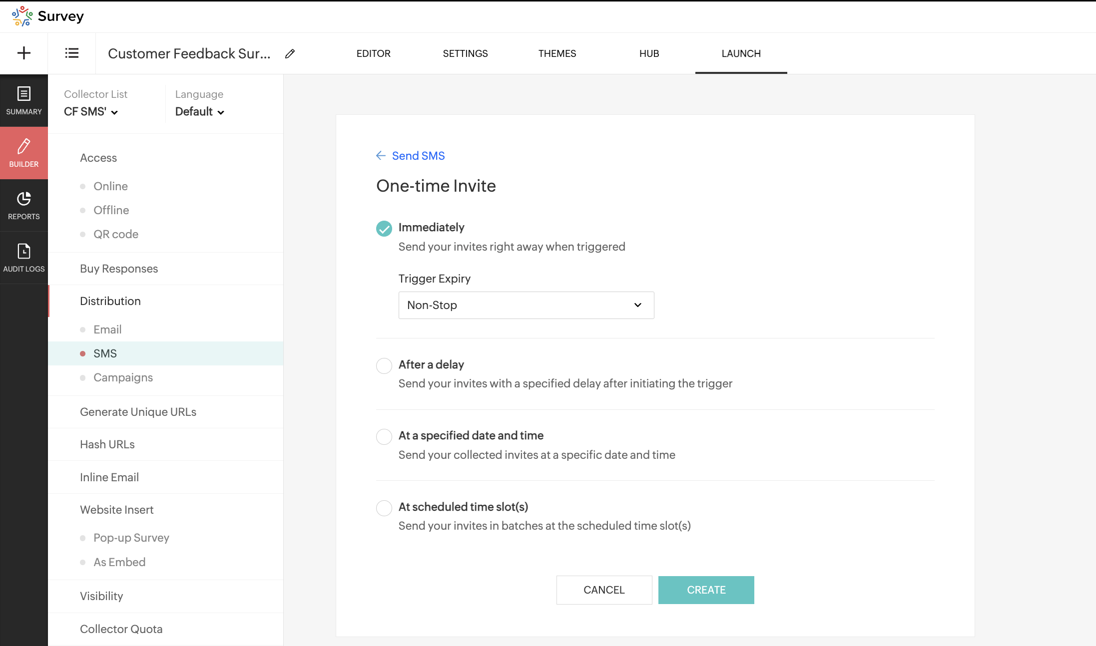 - In the Zoho Survey portal, navigate to the Launch tab, then click Create SMS.