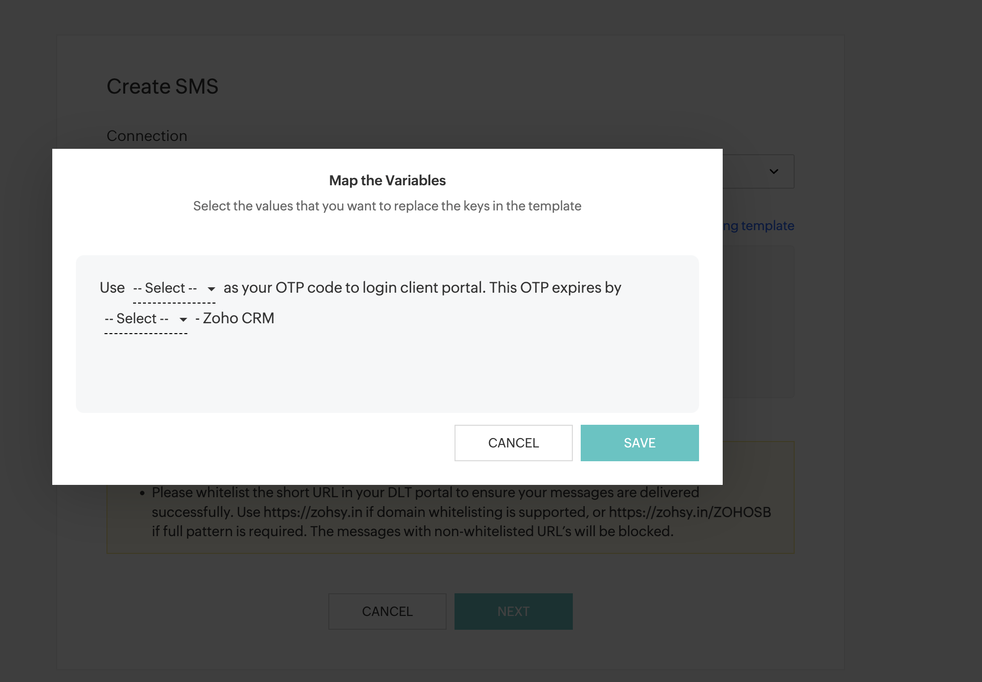 - Then select the Zoho SMS Service as the Connection. Click on the Import DLT file button and upload your DLT file containing the custom message to be sent as SMS.