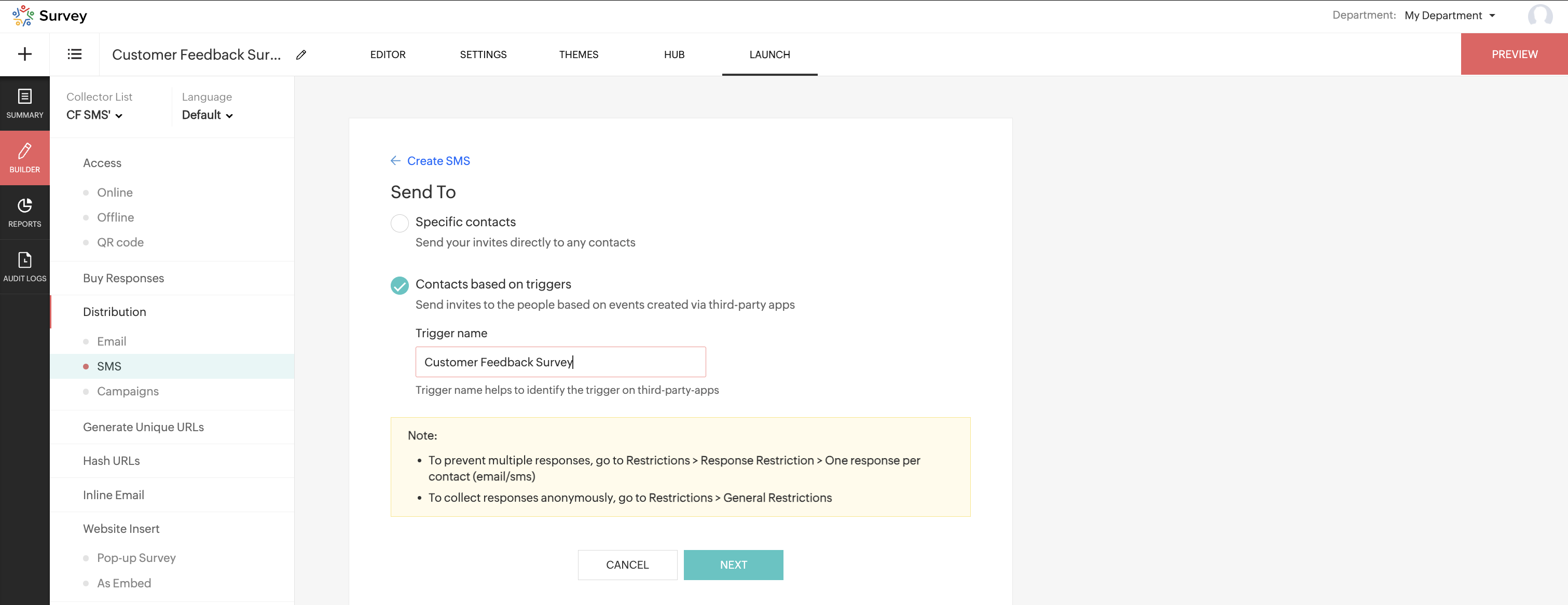 Triggers are events that cause a certain action to happen when a pre-defined event occurs. With Zoho Survey's SMS triggers, users can send survey forms as trigger invitations.