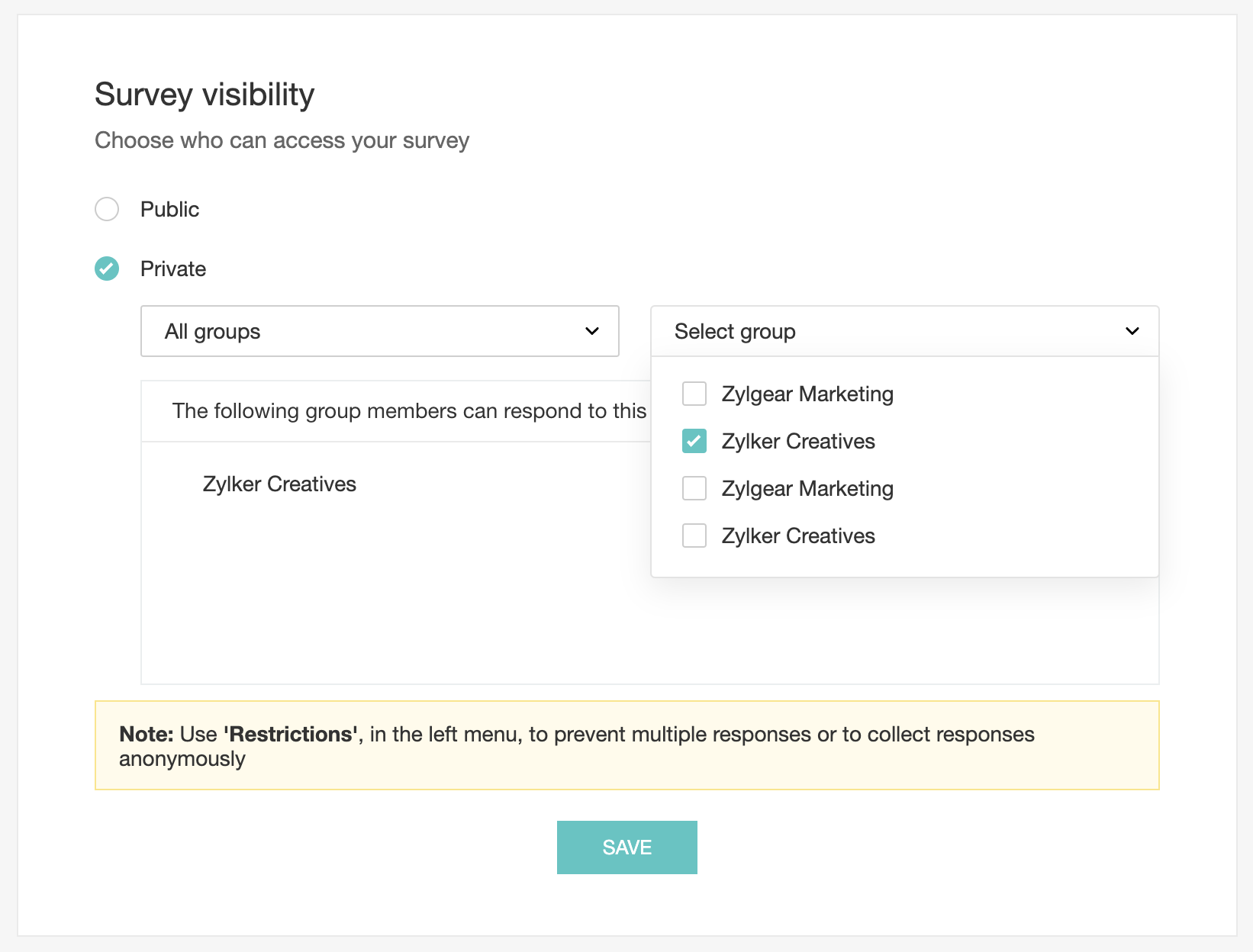Make your surveys secure with these safeguarding features by which you can determine how your surveys will be accessed and by determining who can access reports through sharing. You can set the visibility of a survey to public so that anyone can respond, or make it private to target specific groups. When you share a survey with a private group, only the members of that group can respond to it. This feature is useful for people who have registered as an organization with Zoho.
