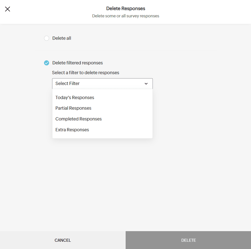 In the Delete filtered responses, you can select only responses from particular time or custom filter.