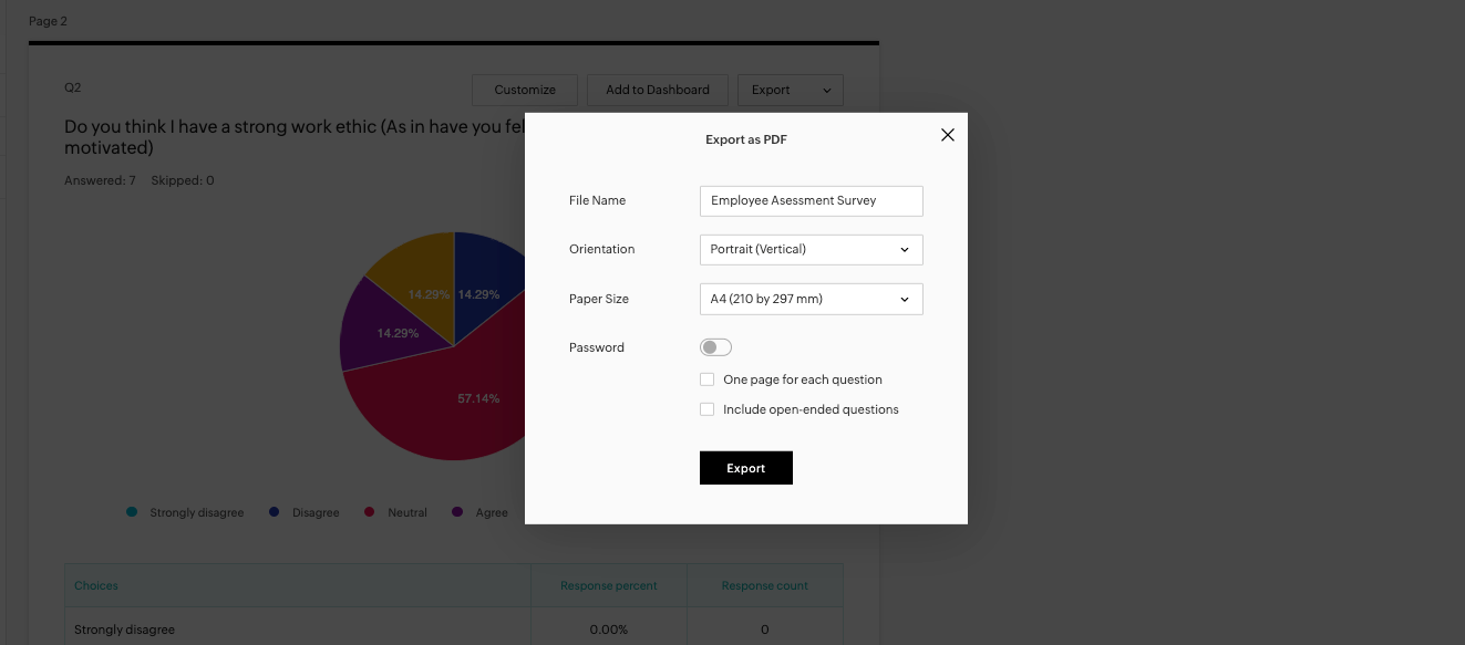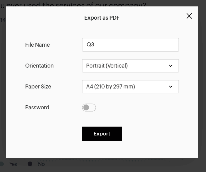 To export as PDF, provide the Filename, Orientation, Paper Size, and Password. Click Export to export the PDF.