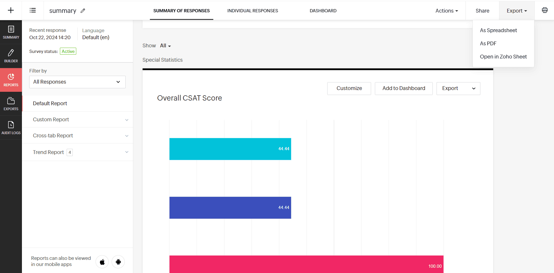 Collect all the responses and export in many file formats like Spreadsheets, PDF, and Zoho Sheet.