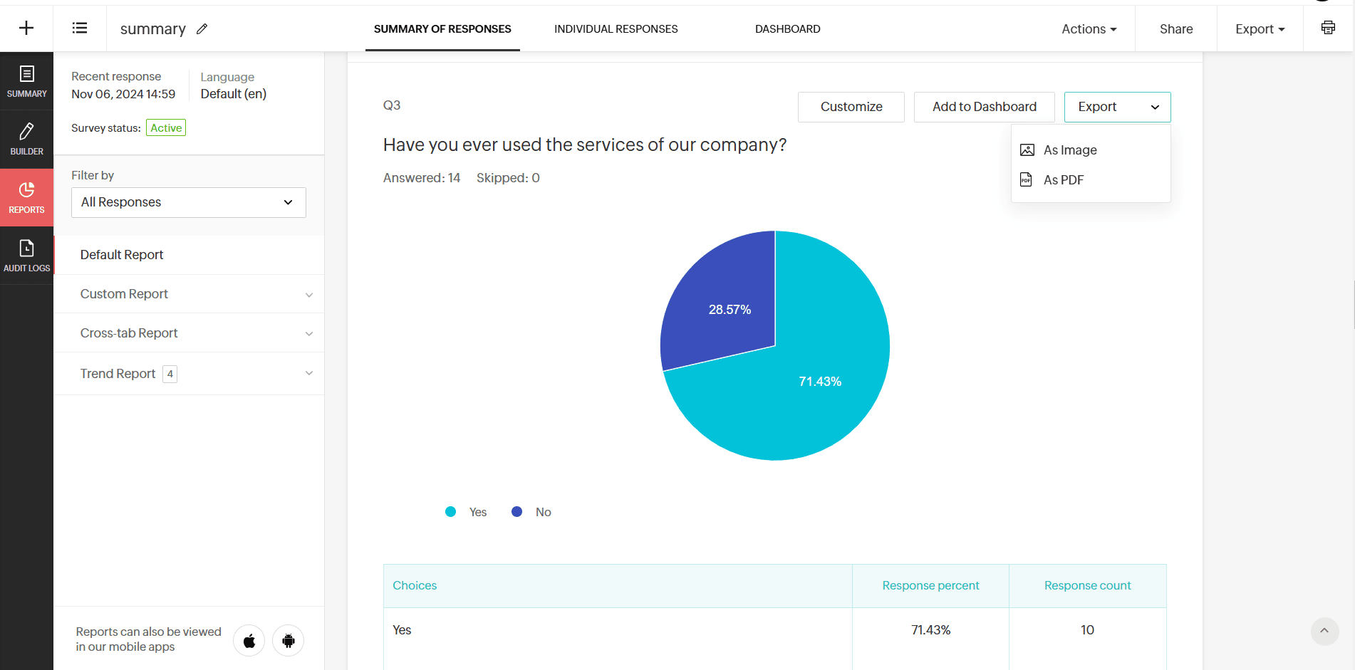 Go to Reports, choose the responses to a particular question that you want to export as an image or PDF. All the responses to that question will be collected.