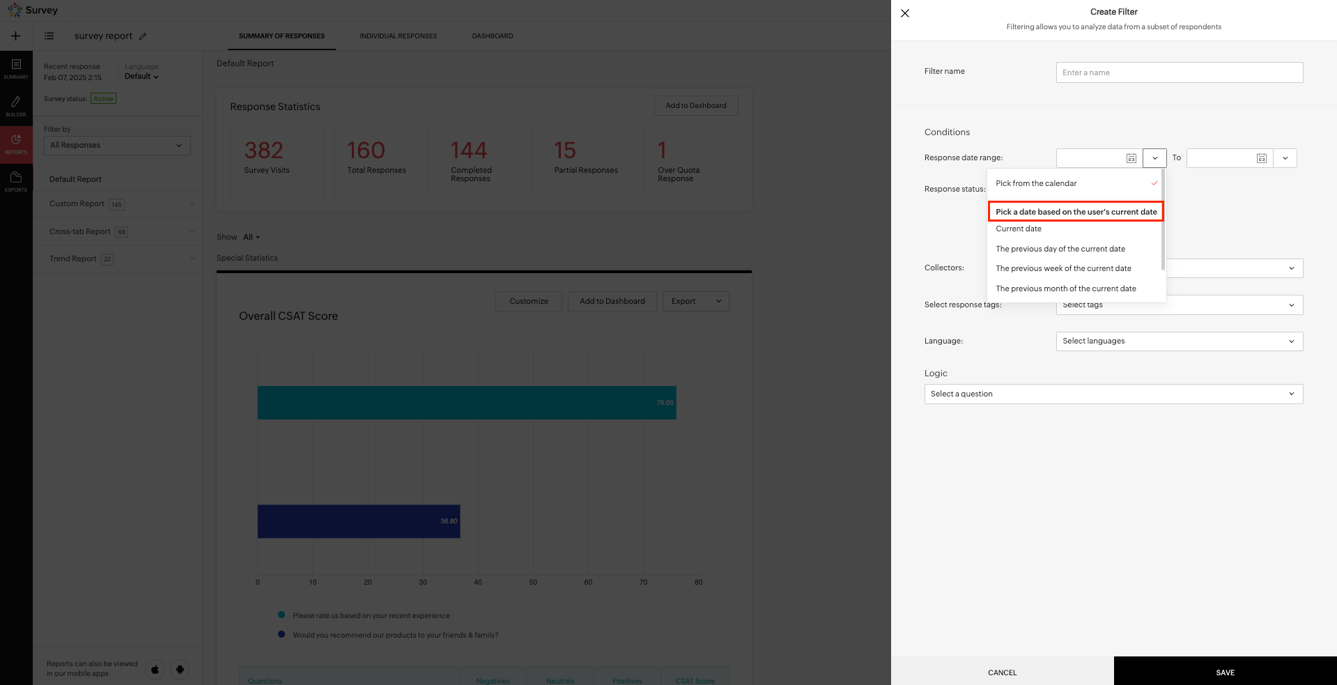 - Response date range - Select a range of the responses submitted between the dates. You can even use the options under Pick a date based on the current date which lets you create dynamic filters based onn date range.