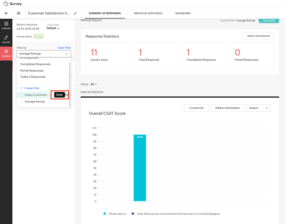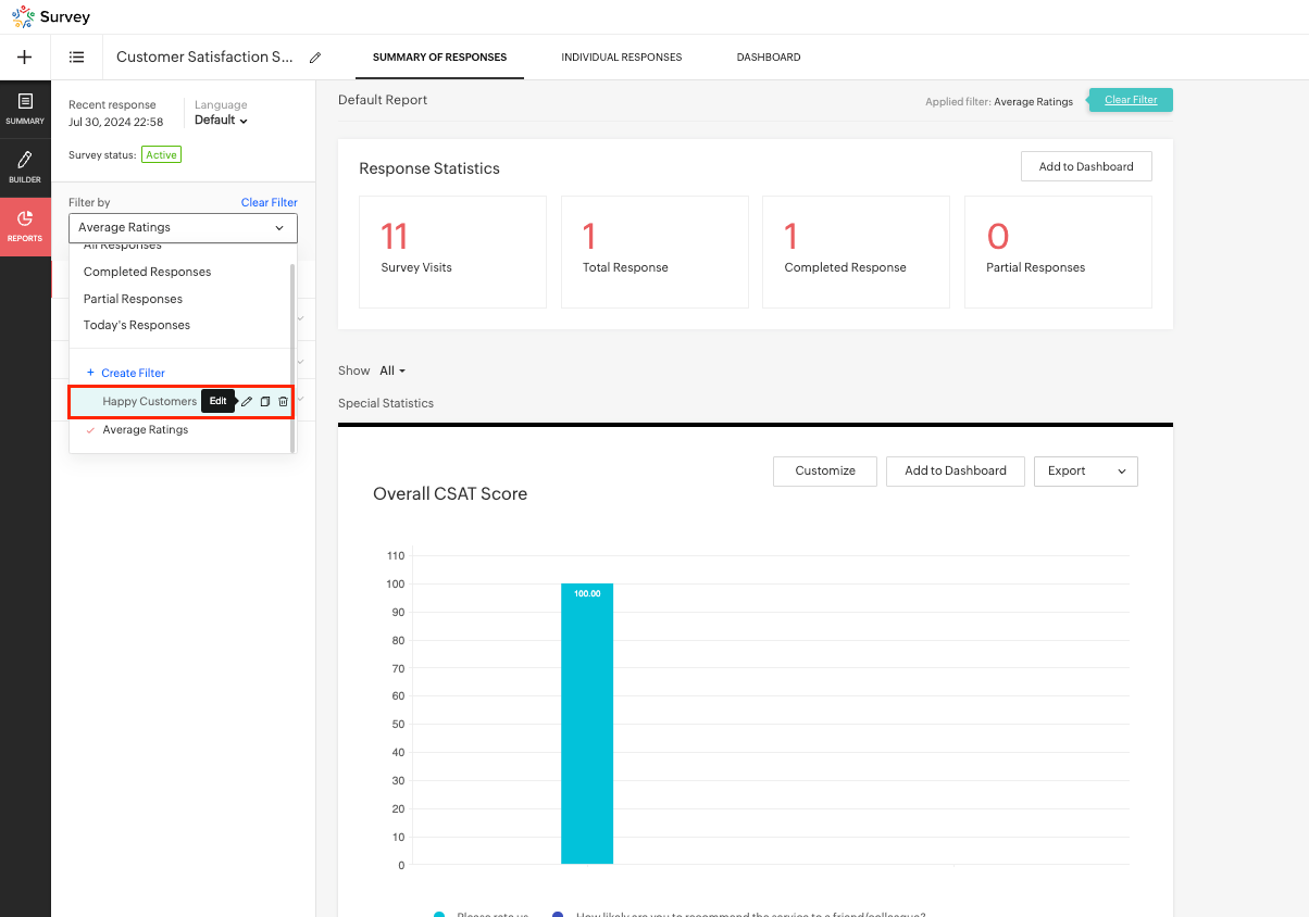 A Customer Success professional proactively analyzes survey feedback to identify and address customer concerns before they escalate. For example, for a product feedback survey, if the customer expressed an unsatisfactory experience with your service, you can create a filter to target only such responses and take proper measures.