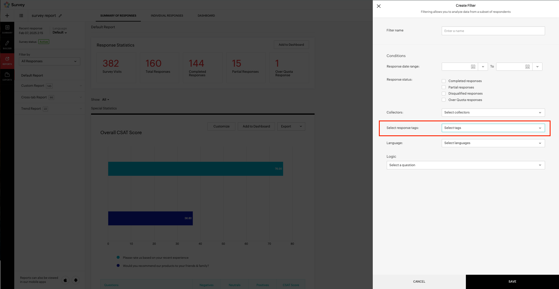 - Response status - Choose the response status as completed, partial, disqualified, or over quota responses.