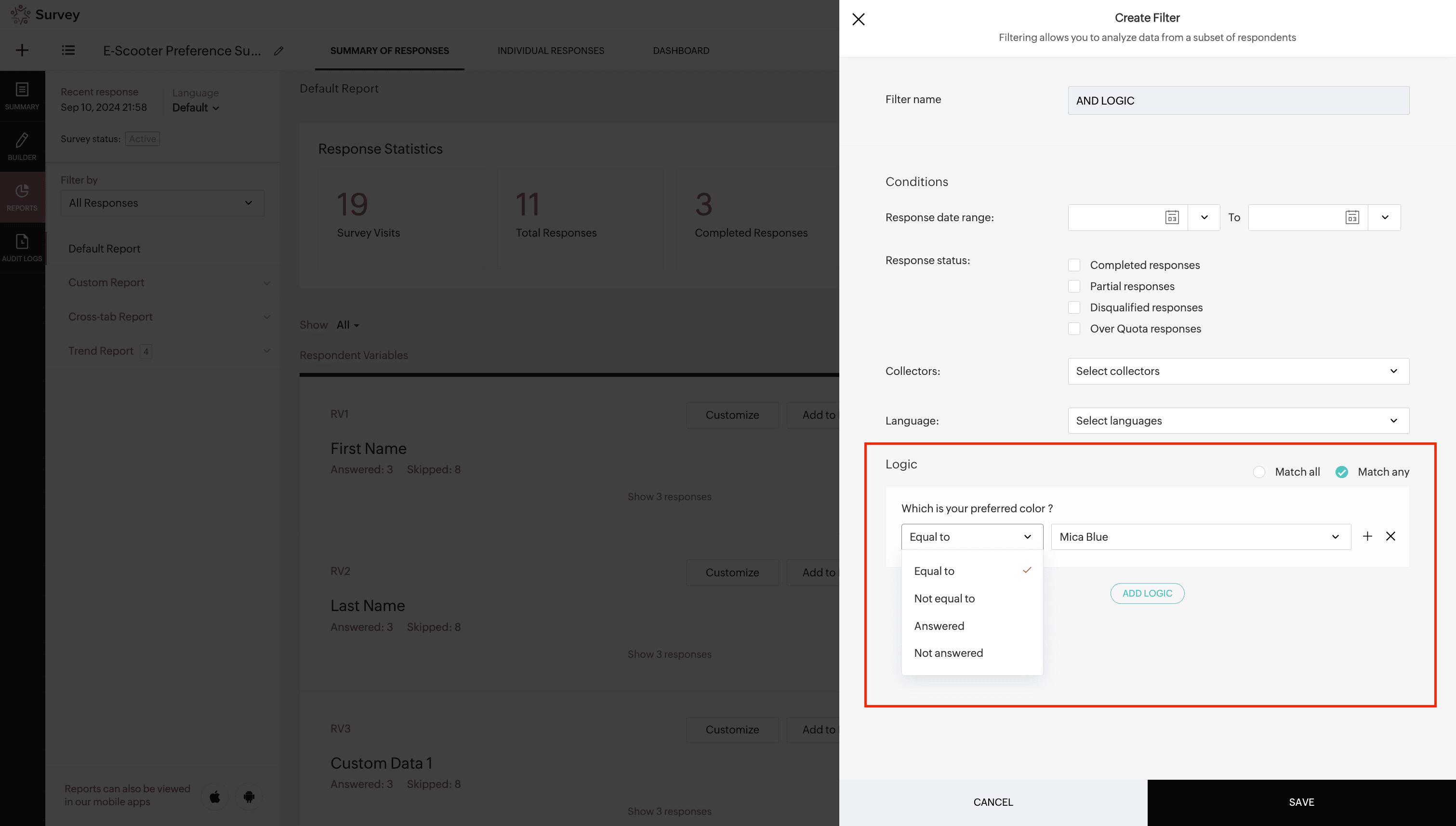 - Logic - Set logic for the questions based on which you have to perform certain actions. While setting logic, the questions, respondent variables, and custom variables can be chosen to create the required filter.