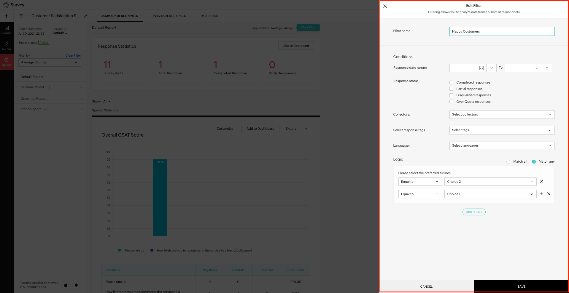 - Filter name - Give a name for the filter you are creating. Ex - Unhappy customers.