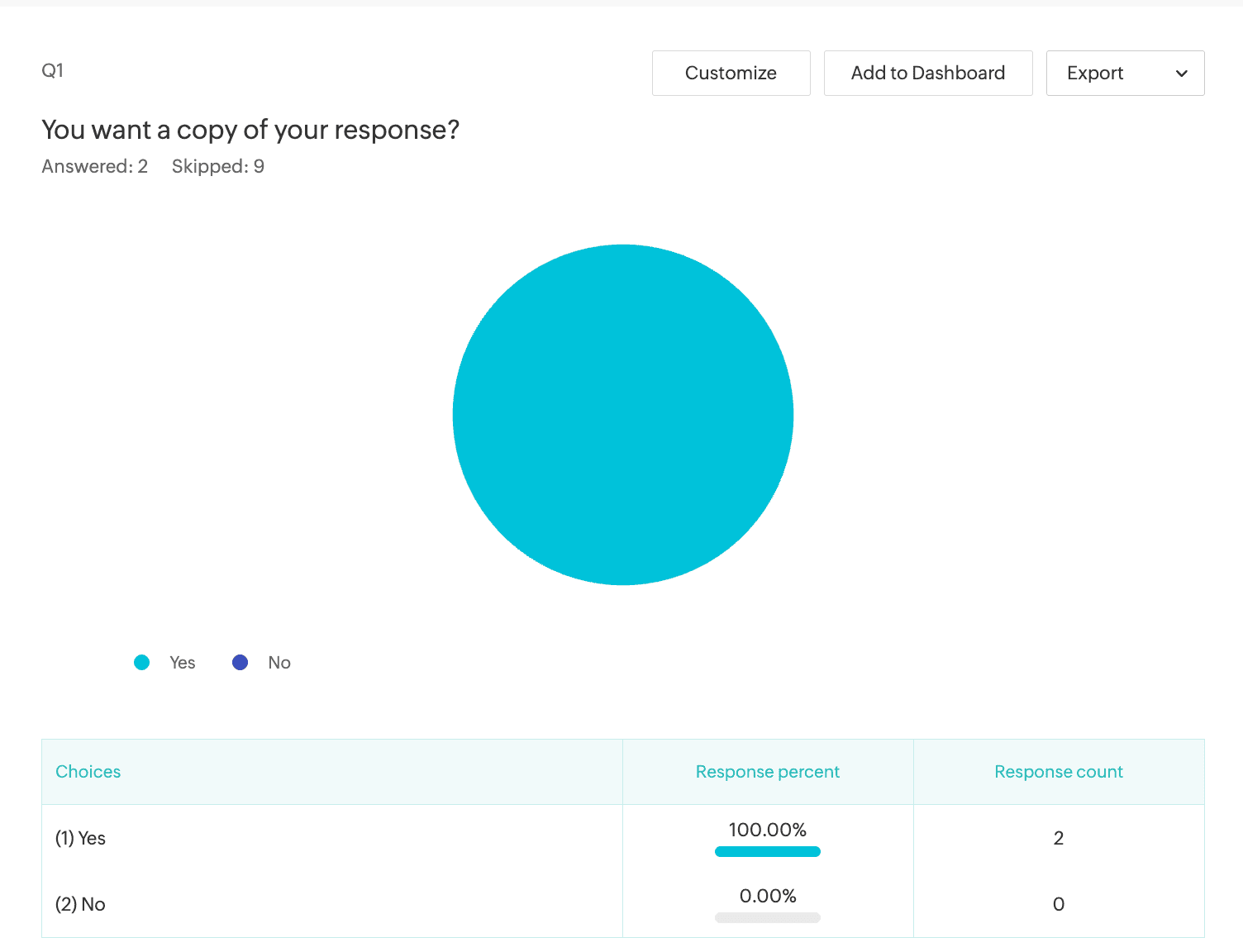 Get detailed information about responses in real time with Zoho Survey's reporting tools. Customize reports and set up a schedule to deliver them, or compare different reports and filter your responses by the criteria you set. You can view a summary of all responses.You can view response stats such as: