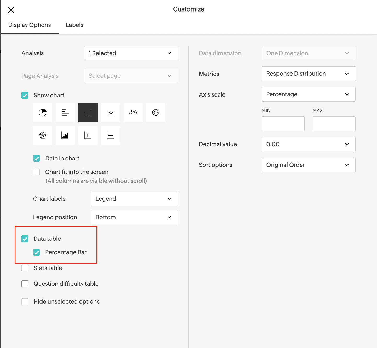 - Percentage Bar- The percentage bar represents response percentages using a horizontal bar. The bar colour aligns with the option’s assigned color, making it easier to interpret data quickly and accurately.
