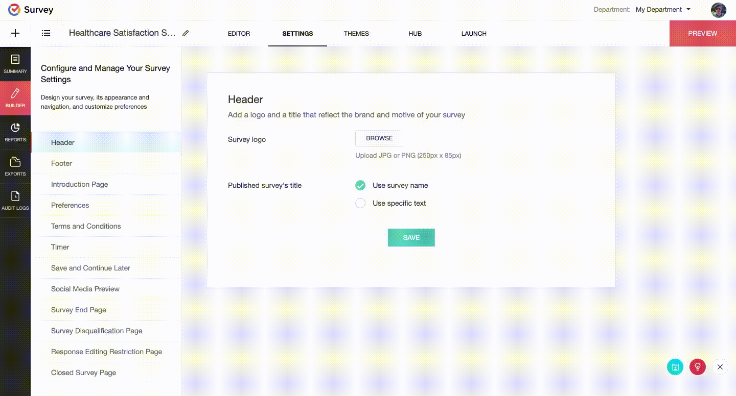 The Survey Preferences section enables you to show the progress bar, question numbers and previous button, enable CAPTCHA, personalize the navigation buttons' labels, and change the language of your survey's messages. Learn how you can customize response preferences here.