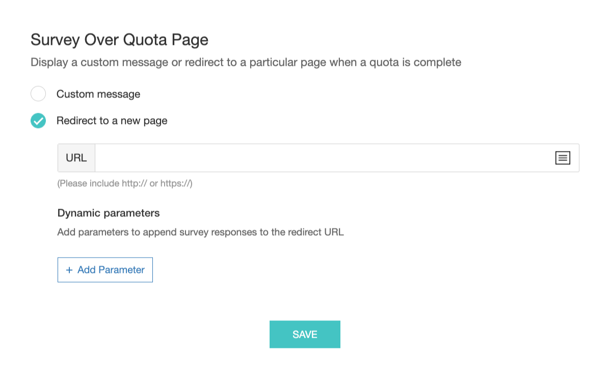 Redirect to a new page - Select this option and enter the URL in the URL field to redirect your respondents to a new page.